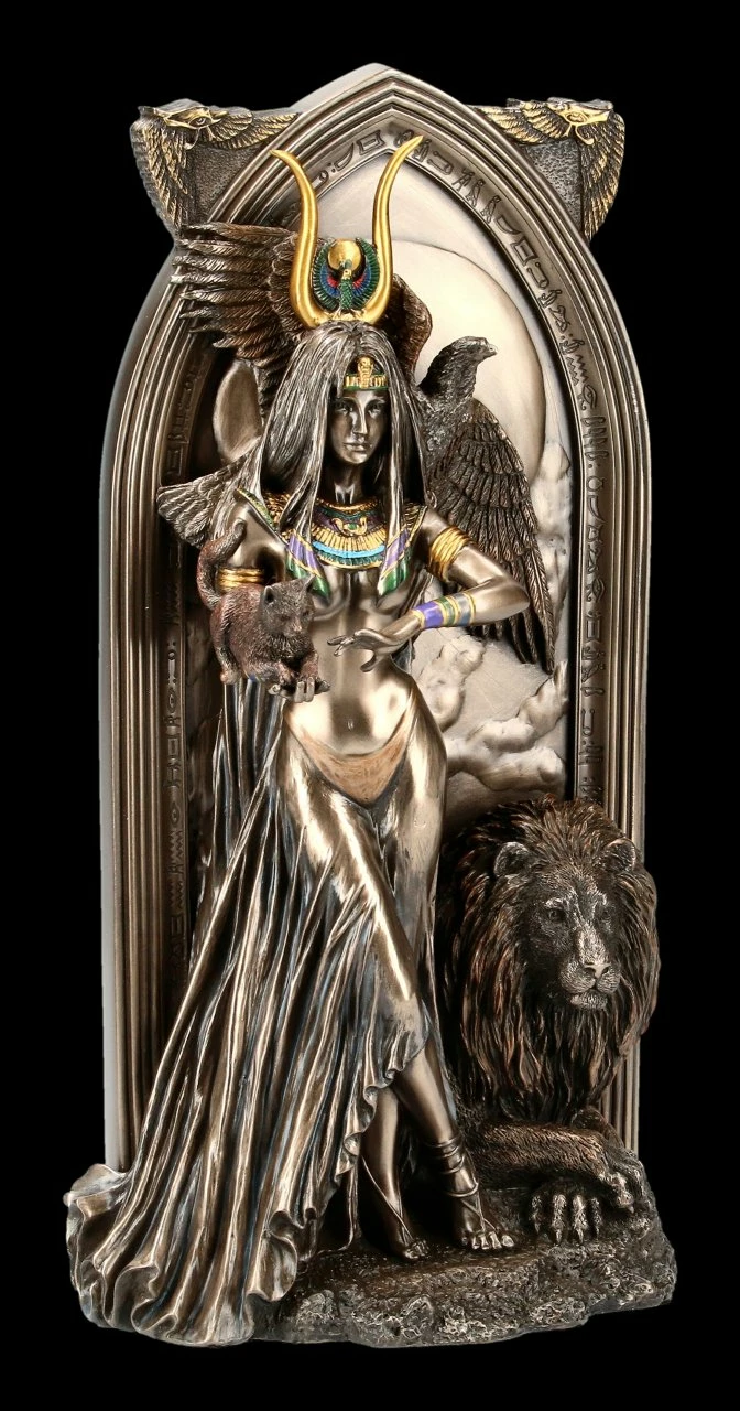 Aus der Fantasie der bekannten Künstlerin Ruth Thompson stammt diese schöne Priesterin aus dem alten Ägypten. An der Seite der schönen Priesterin mit dem ägyptischen Kopfschmuck, dem detailreichen Kragen und Schmuck und dem seidig glänzenden transparenten Rock, sitzt friedlich ein großer Löwe. Hinter ihrer Schulter ist ein Adler zu sehen und auf ihrem rechten Arm sitzt eine Katze. Auf der Rückseite des Tores, vor dem die Priesterin steht, ist das Gedicht ‚The Tyger‘ von William Blake zu lesen. Die schöne Statuette von Veronese ist aus edel bronziertem und wunderschön coloriertem Kunststein (Polyresin) gefertigt und hat eine Höhe von 26,5 cm, eine Breite von 13,5 cm und eine Tiefe von 7,5 cm. Für alle, die von der ägyptischen Kultur fasziniert sind, ist diese schöne Priesterin eine wunderbare Deko und ein toller Blickfang in jedem Raum.