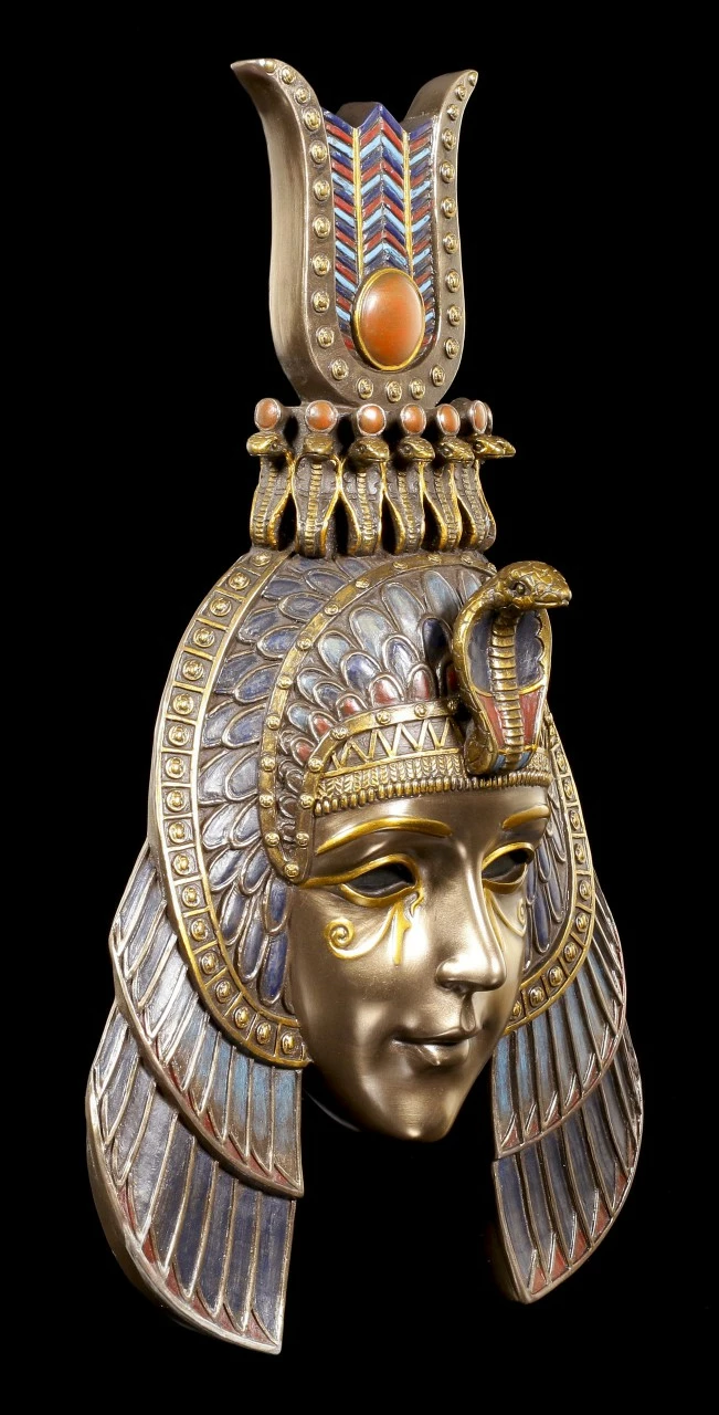 Diese Maske von der schönen ägyptischen Königin ist eine Hommage an die geheimnisvolle und sagenumwobene Kleopatra und erinnert an ihre Herrschaft als Pharaonin und an ihre schicksalsträchtige Liebesbeziehung. Die Maske stammt vom bekannten Hersteller Veronese und wurde mit viel Liebe zum Detail ausgearbeitet.