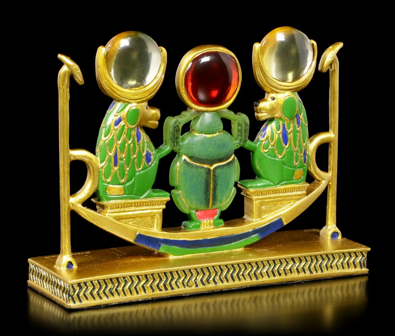 Aus der Serie Ancient Egypt ist diese tolle ägyptische Figur aus handbemaltem Kunststein (Polyresin). Das umwerfende Design besticht genauso wie die tollen Farben. Die beiden Affen sitzen links und rechts neben einem Skarabäus. Zusammen sind sie auf einer ägyptischen Barke. Alle drei haben die Sonnenscheibe auf ihrem Kopf – die Affen aus einem klaren durchsichtigen Resin Stein und der Skarabäus in Rot.