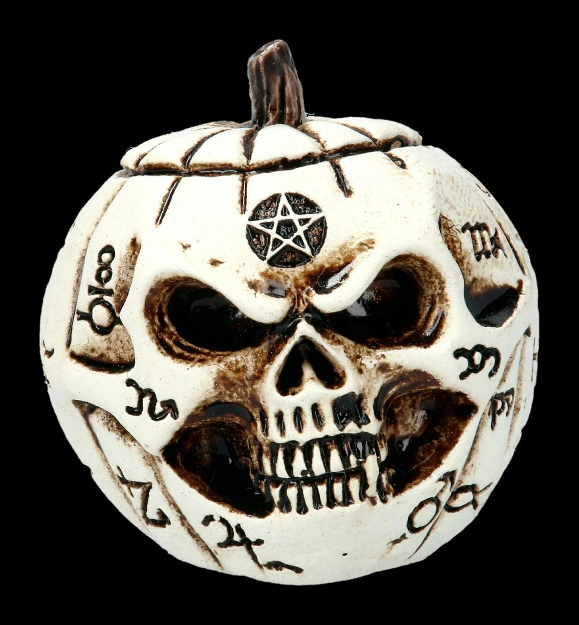 Von Alchemy England ist dieser kleine fiese, aber trotzdem lustige, Kürbis-Schädel aus handbemaltem Kunststein (Polyresin). Er ist 3,5 cm hoch, 3 cm breit und 3 cm tief. Der kleine Kürbis ist nicht nur an Halloween eine lustige Deko.
