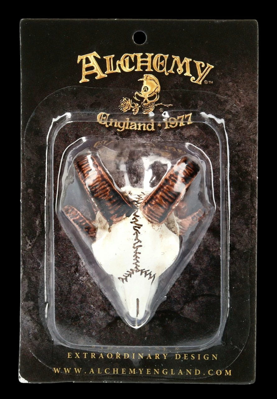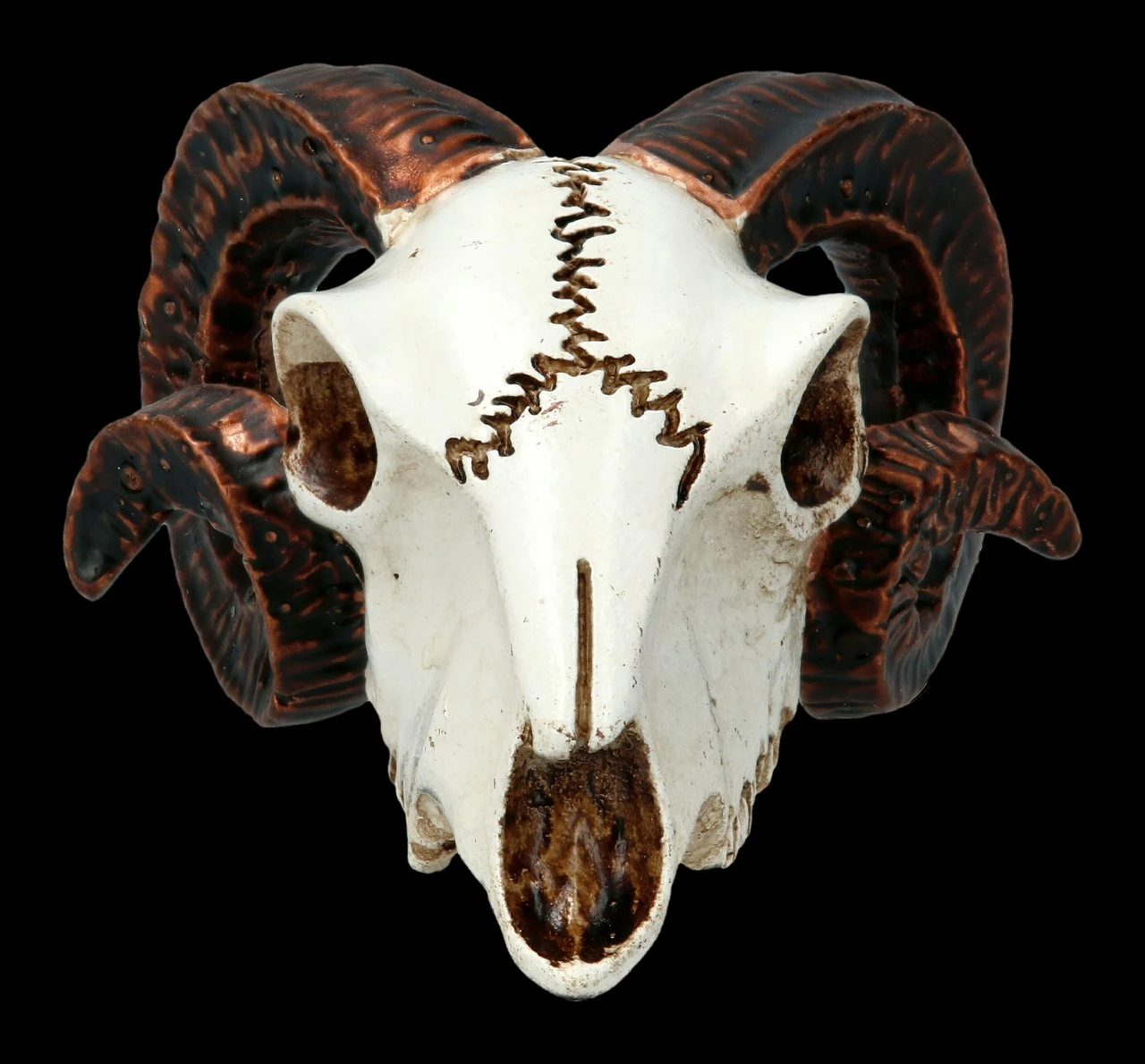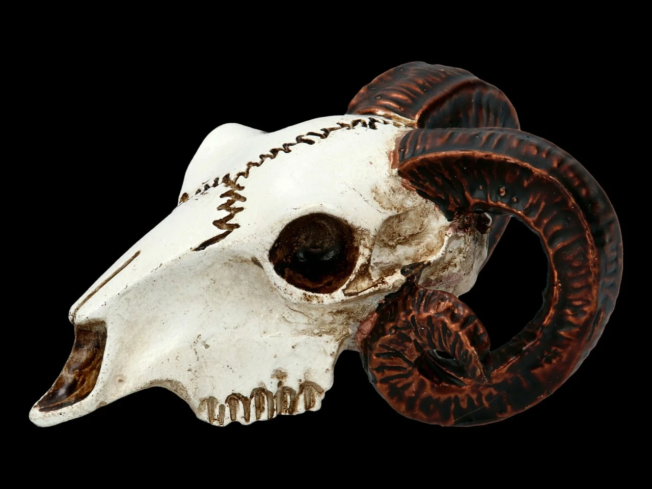 Obwohl der kleine Widder-Totenkopf nur eine Höhe von 2,5 cm, eine Breite von 4 cm und eine Tiefe von 5 cm hat, ist er sehr detailreich aus handbemaltem Kunststein (Polyresin) gefertigt..Gerade weil er so klein ist, ist dieser Widderschädel von Alchemy England ein interessantes Objekt.