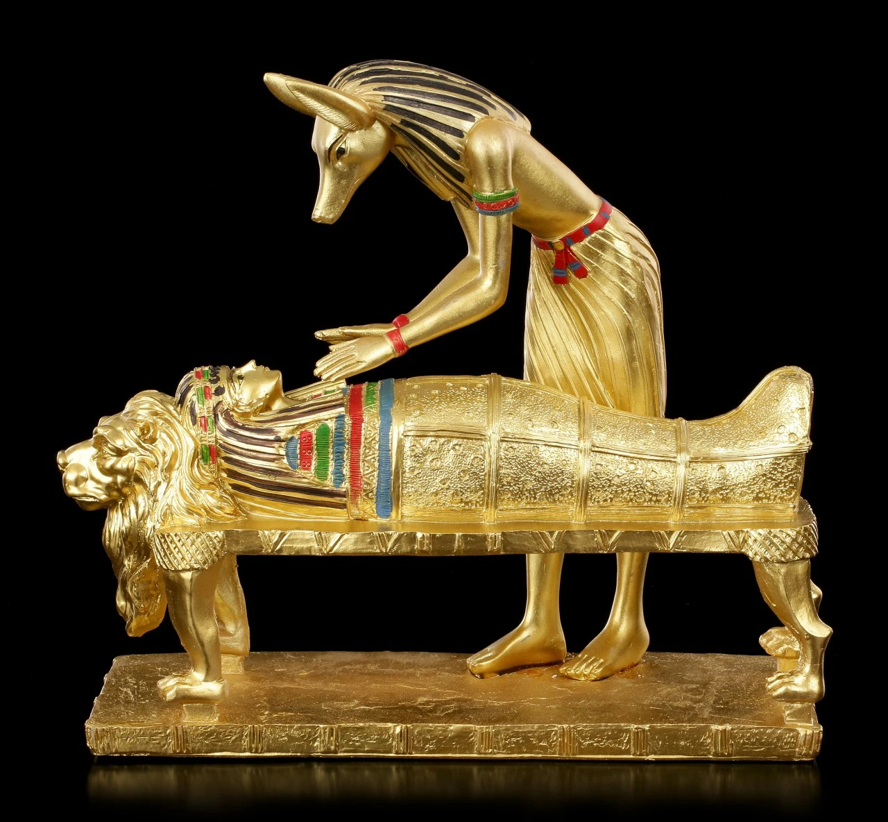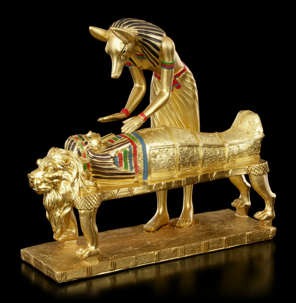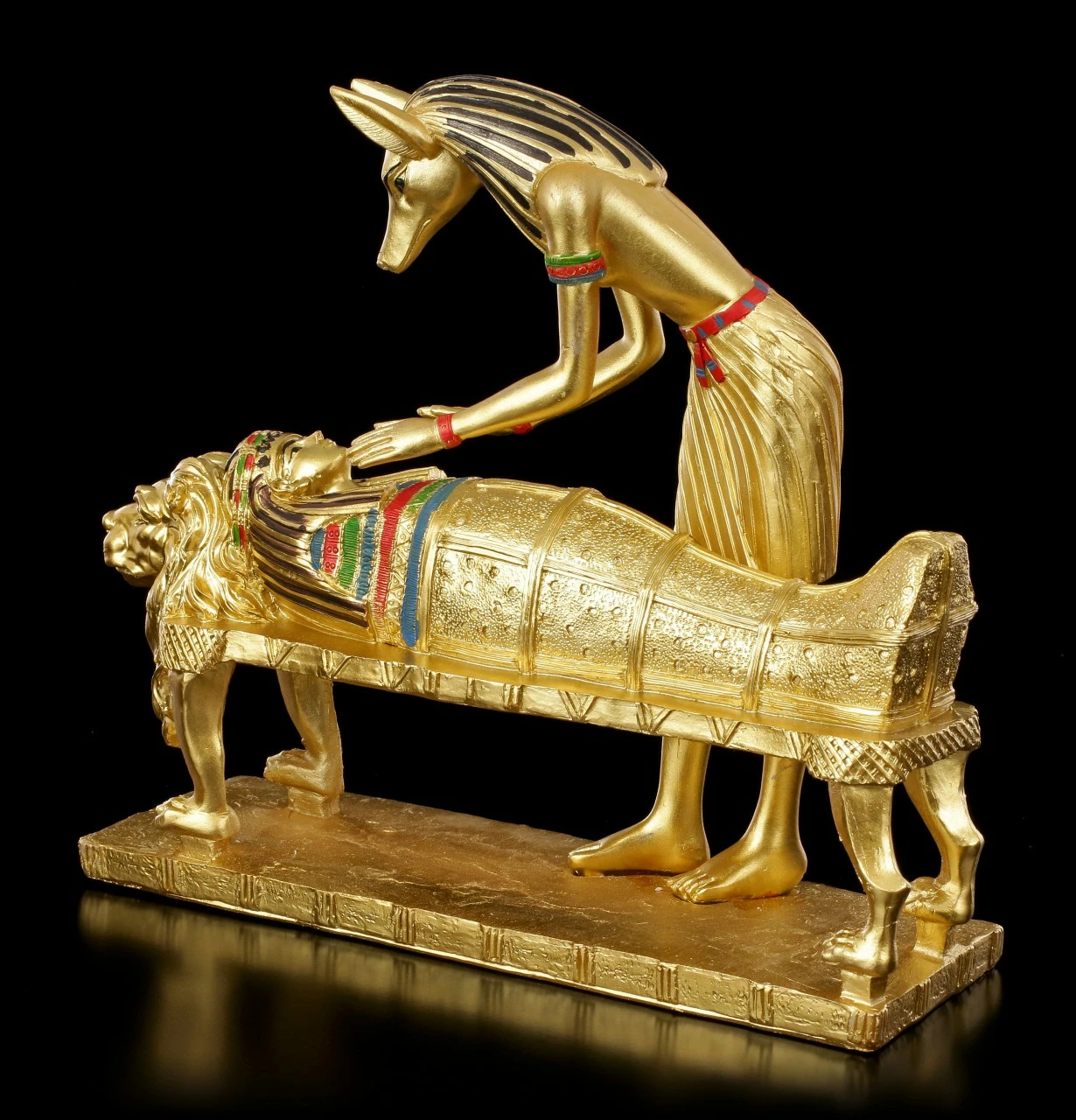 Diese wunderschön detailreiche Figurenkomposition ist eine elegante Nachbildung eines alt ägyptischen Wandgemäldes, das bei vielen altägyptischen Gräbern gefunden worden ist. Es zeigt Anubis bei der Mumifizierung eines verstorbenen Körpers. Die Mumifizierung war eine wichtige und heilige Zermemonie, die sofort nacht dem Tot durchgeführt wurde. Nur so konnte die Seele im Jenseits mit ihren Körper das irdische Leben wieder fortsetzen.