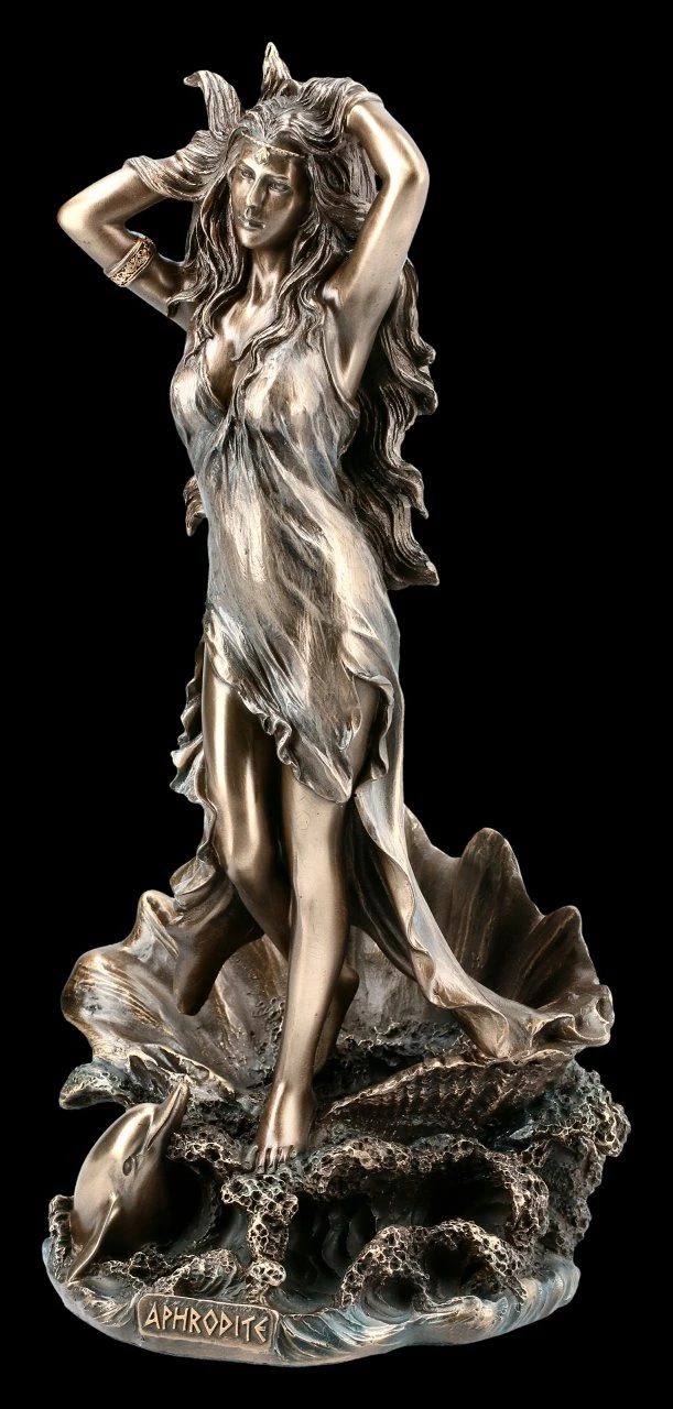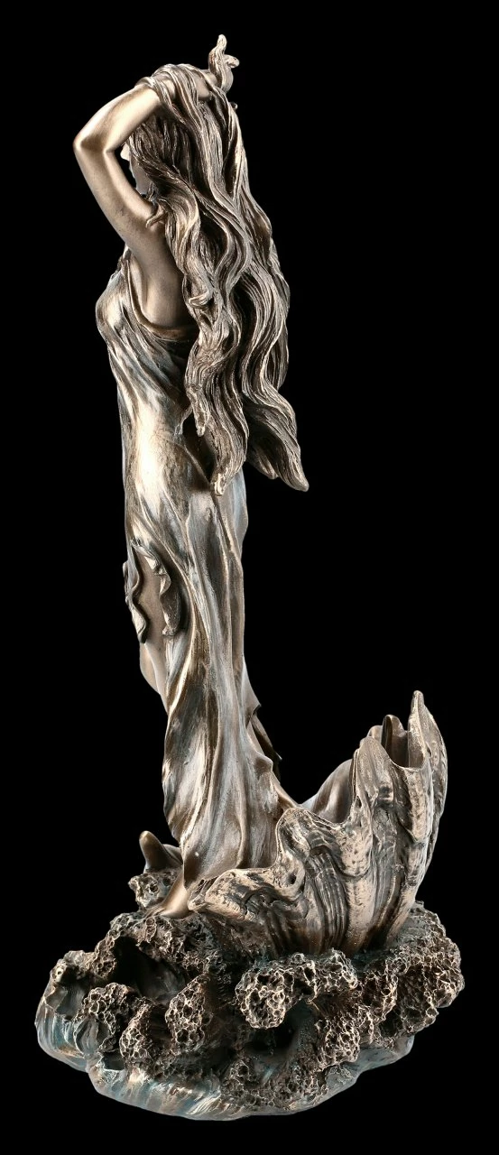 Stellen Sie sich vor – Sie sehen, wie sich am Strand eine Muschel öffnet, aus der die griechische Göttin der Liebe, der sinnlichen Begierde und der Schönheit in all ihrer Pracht entsteigt. Die griechische Göttin Aphrodite ist eine wunderbare Ergänzung zu jeder Göttersammlung. Diese dynamische Darstellung aus dem Haus Veronese gehört zur Serie The Triumphs of Humanity und wurde aus edel bronziertem und fein coloriertem Kunststein (Polyresin) geschaffen. Die herrliche, 28 cm hohe, 14 cm breite und 12 cm tiefe Figur der griechischen Göttin Aphrodite ist ein außerordentlich dekorativer Blickfang und ein wunderbares Geschenk für jeden, der die Schönheit dieser Aphrodite-Figur zu schätzen weiß.