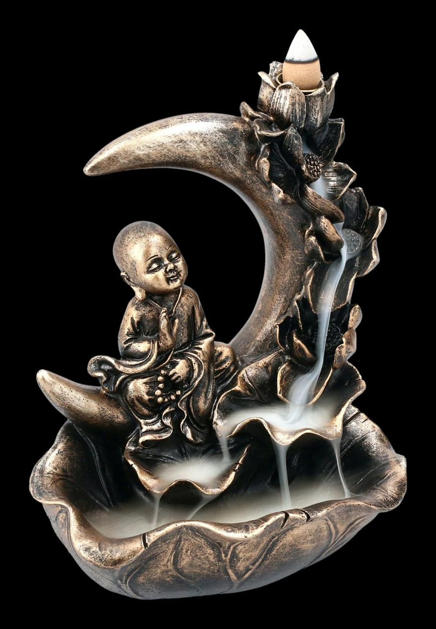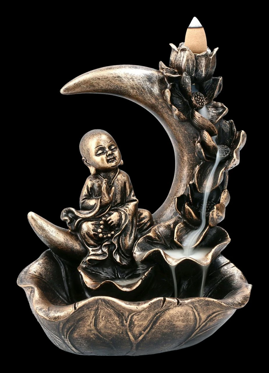 Dieser 18,5 cm hohe, 15 cm breite und 9,5 cm tiefe Backflow Räucherhalter verbreitet mit der meditativen Ausstrahlung ein wunderbar beruhigendes Gefühl. Der Räucherkegelhalter mit dem Buddha, der selig lächelnd auf der mit einer Blumenranke bewachsenen Mondsichel sitzt, ist fantastisch detailreich aus handbemaltem Kunststein (Polyresin) gefertigt. Wenn der Räucherkegel brennt, fließt sanfter Nebel in die Lotusblüte zu Füßen des kleinen Buddhas. 3 Backflow Räucherkegel sind übrigens inklusive. Beachten Sie aber bitte unbedingt die Sciherheitshinweise zu unseren Backflow Räucherhaltern.
