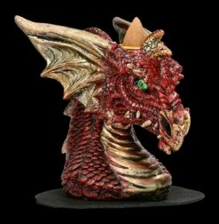Etwas bockig wirkt der kleine rote Drache, aber wenn der Dunst vom Backflow Räucherkegel seinen Kopf umhüllt, ist der zornige Blick aus seinen leuchtend grünen Augen nur noch zu ahnen. Der kleine rote Drachenkopf als Backflow Räucherhalter aus handbemaltem Kunststein (Polyresin) ist 10 cm hoch, 8,5 cm breit und 10 cm tief. Ein Backflow Räucherkegel ist inklusive, weitere Backflow Räucherkegel finden Sie in unserem Shop. Der Räucherhalter mit dem Drachenkopf ist ein wunderbares Geschenk für jeden Drachenfreund.