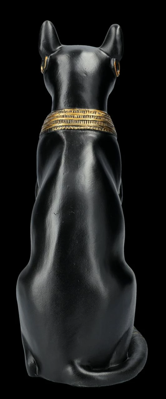 Im Alten Ägypten wurde die Katzengöttin Bastet als Göttin der Freude, des Tanzes, der Musik und der Feste, aber auch als Göttin der Fruchtbarkeit und der Liebe verehrt. So galt Bastet im Alten Ägypten auch als Beschützerin der Schwangeren. Die wenigen goldenen Akzente machen aus der schwarz handbemalten Göttlichen Katze einen besonderen Blickfang. Die Bastet-Figur aus Kunststein (Polyresin) ist 21 cm hoch, 8 cm breit und 12,5 cm tief. Sie hat so zahlreiche freudige Bedeutungen, dass sie einfach auch als wunderbares Geschenk geeignet ist.