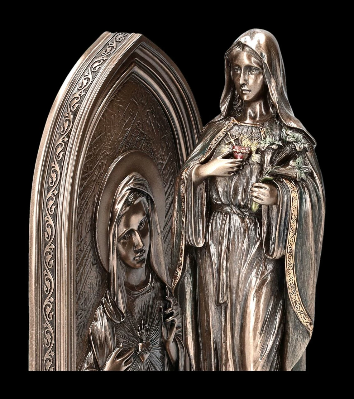 Alle Bücher mit am Herzen liegenden Themen werden mit dieser wunderbaren Buchstütze mit der Marien Figur ‚Unbeflecktes Herz Mariä‘ perfekt gestützt. Seit der Urkirche gehört die Verehrung Marias und das ‚Unbefleckte Herz Mariä‘ zur römisch-katholischen Spiritualität. Von Papst Pius XII wurde mitten im Kriegsgeschehen von 1942 nach dem Herz-Jesu-Fest der 22. August für die gesamte katholiche Kirche zum Gedenktag ‚Unbeflecktes Herz Mariä‘ ernannt und mit der immer so aktuellen Bitte verbunden: „Bitte für uns, Königin des Friedens, und gib der Welt, die vom Krieg helabelesucht ist, den Frieden nach dem die Völker seufzen, den Frieden in der Wahrheit, in der Gerechtigkeit und in der Liebe Christi“. Die 22 cm hohe, 12,5 cm breite und 14 cm tiefe Buchstütze mit der schönen Figur Marias aus der Studio Collection von Veronese wurde aus hochwertigem Kunststein (Polyresin) gefertigt. Sie wurde sorgfältig bronziert und fein zurückhaltend coloriert und wirkt dadurch sehr edel. Gemeinsam mit dem passenden Gegenstück, der Buchstütze mit der Jesus-Figur ‚Heiligstes Herz Jesu‘, ist diese edle Marien-Figur als Buchstütze auch ein wunderbares Geschenk.