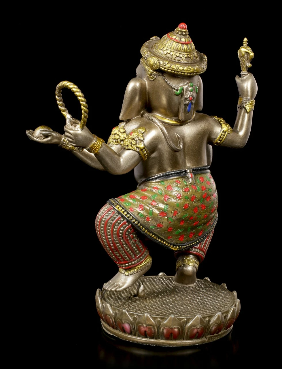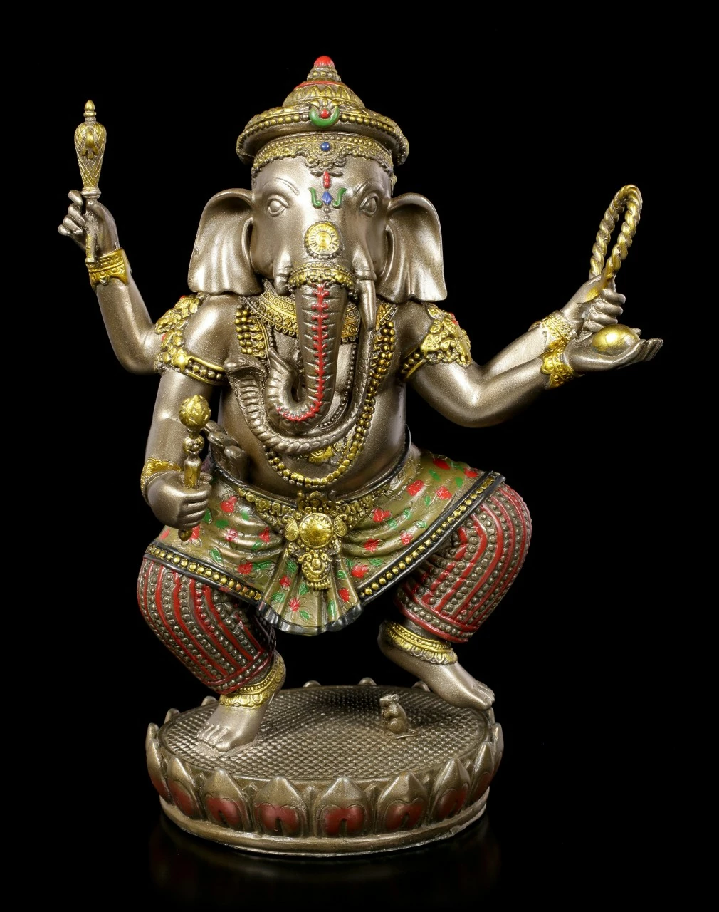 Der tanzende Ganesha ist wohl eine der hinreißenden Darstellungen des hinduistischen Gottes. Die bronzierte und colorierte Figur aus Kunststein (Polyresin) hat unglaublich viele Details, die dem Betrachter erst nach und nach auffallen. Das Seil in seiner Hand z.B. soll die Gläubigen aus ihren weltlichen Problemen ziehen. Der auf einer Lotusblüte tanzende Ganesha ist eine wirklich wunderbar dekorative Figur für jedes Ambiente.