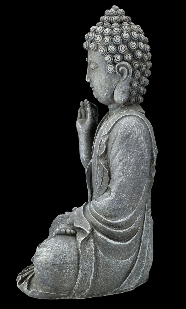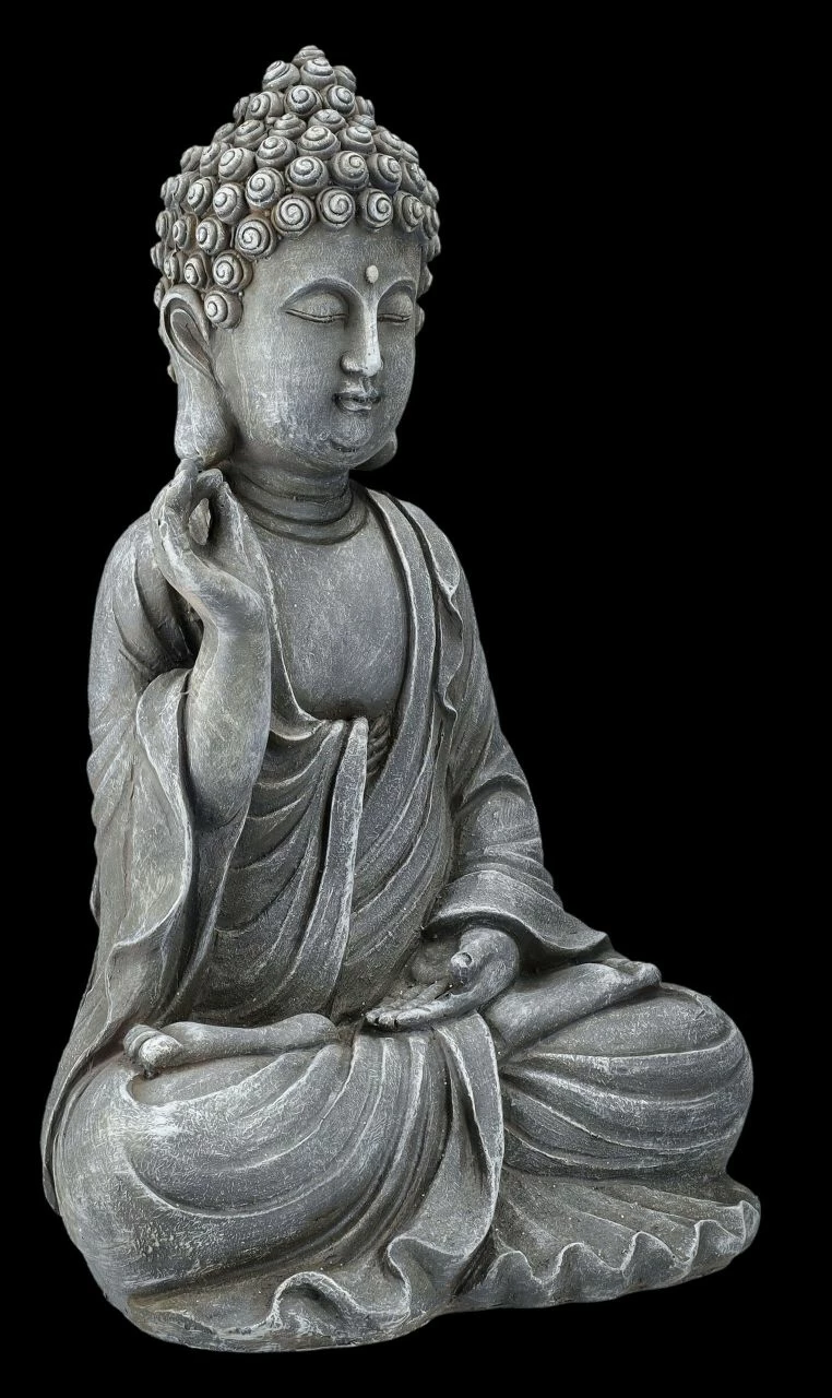 Spirituelle Dekoration: Graue Buddha-Figur in Chin Mudra Pose