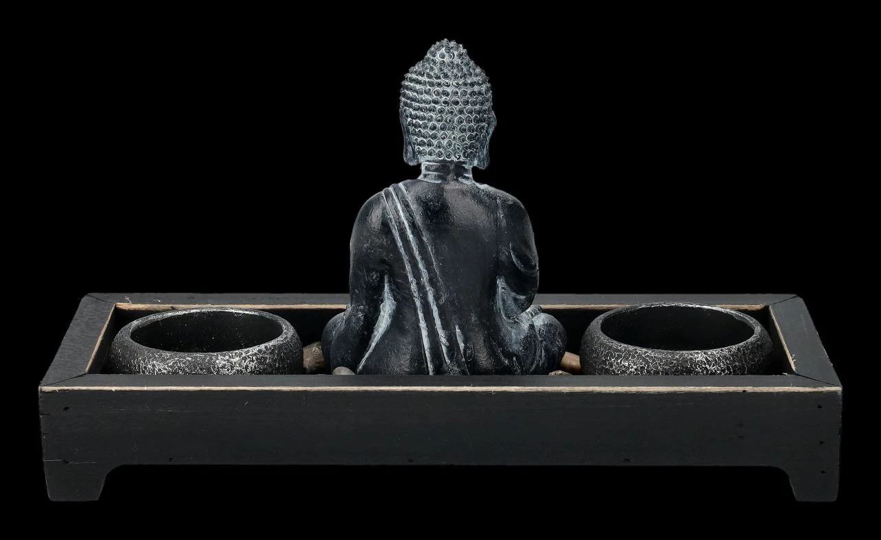 Aus handbemaltem Kunststein (Polyresin) gefertigt, sitzt der 10 cm hohe, 7 cm breite und 5 cm tiefes schwarze Buddha zwischen zwei Teelichthaltern in dem Zen Garten aus Holz. Mit den Steinen vermittelt das insgesamt 12 cm hohe, 20 cm breite und 8 cm tiefe Zen Garten-Set Ihrem Zuhause einen meditativ ruhigen Eindruck.