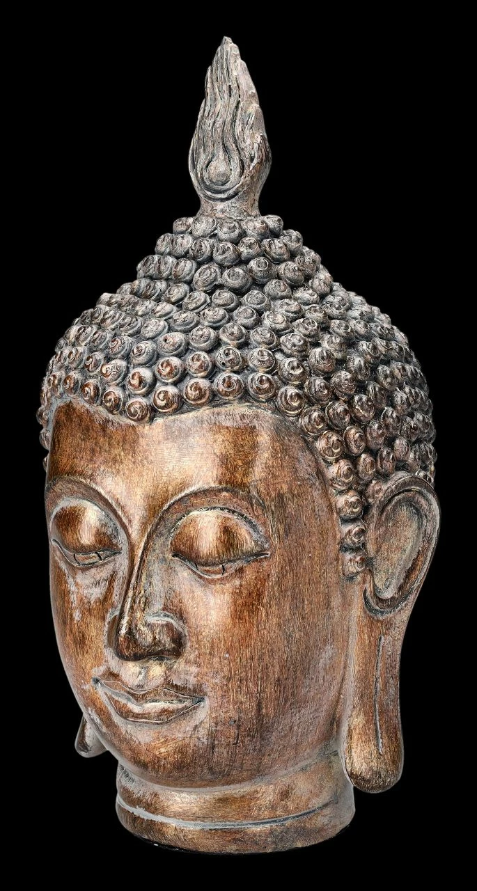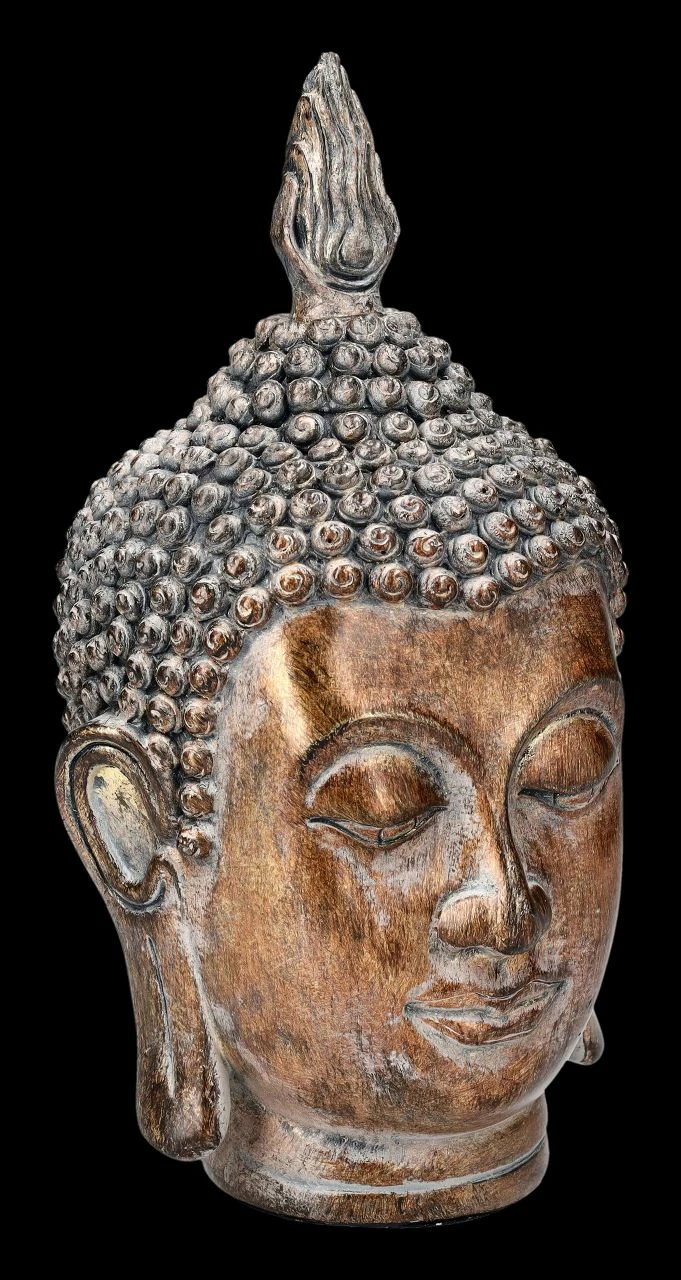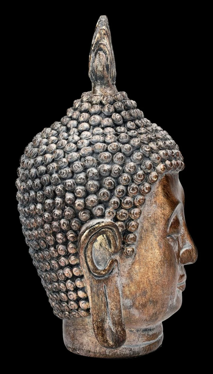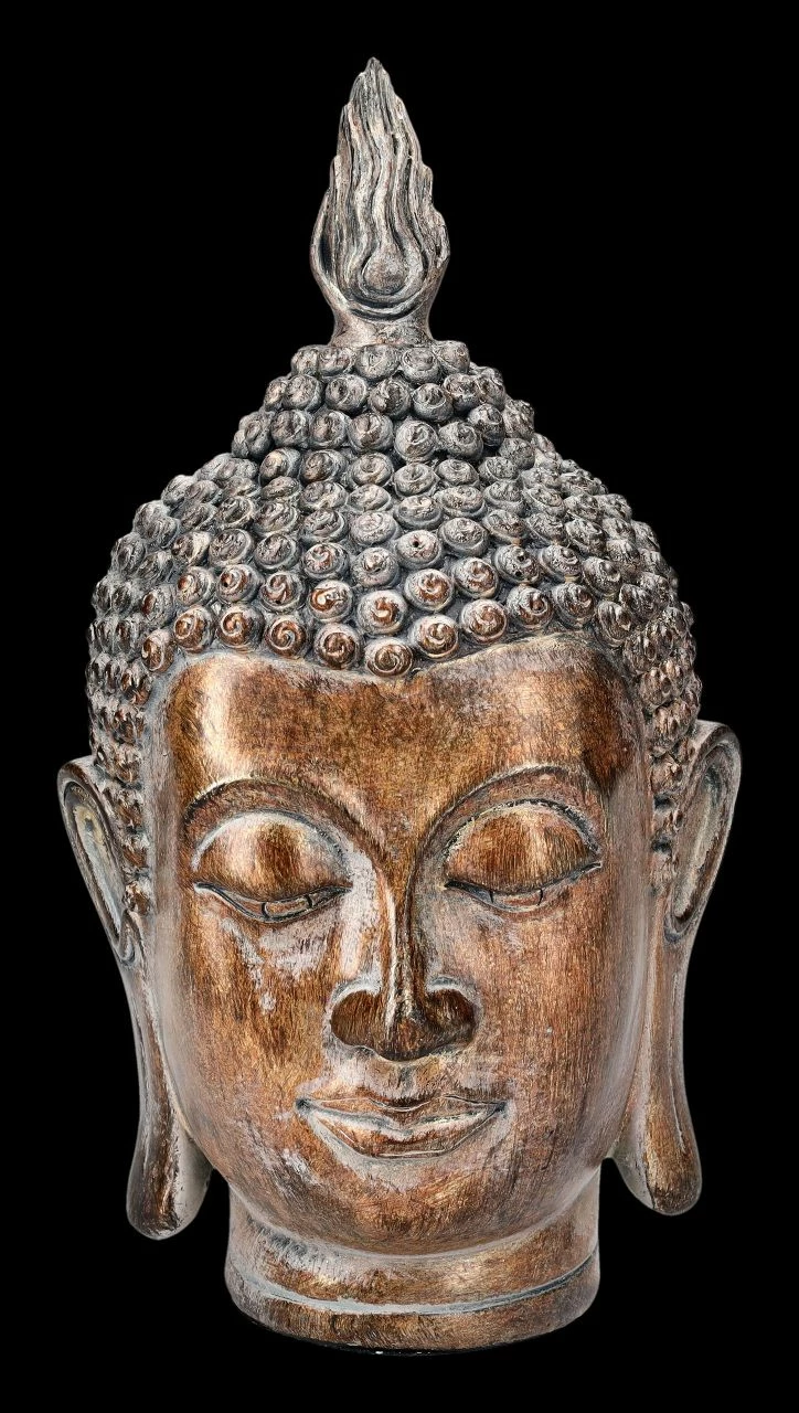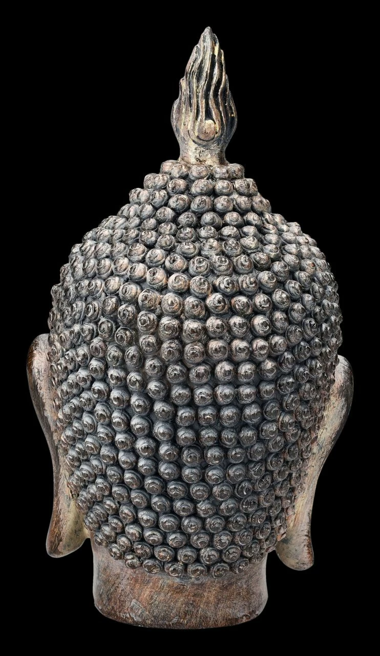 Der schöne Buddha-Kopf mit den großen Ohrläppchen und dem wie eine Flamme aussehenden Haarknoten, den thailändischen Buddhas als Zeichen für die Erleuchtung tragen, bringt als Deko orientalisches Feeling in jedes Ambiente. Der von Hand im braunen Vintage Look bemalte Buddha-Kopf wurde aus Kunststein (Polyresin) gefertigt. Er ist 24,5 cm hoch, 13 cm breit und 13,5 cm tief und sollte einen schönen Platz in der Mitte eines Raumes bekommen, an dem er sofort gesehen wird und für positive Energie sorgen kann. Die meditative Ruhe, die dieser schöne Buddha-Kopf ausstrahlt, wird sich auf jeden Betrachter übertragen.