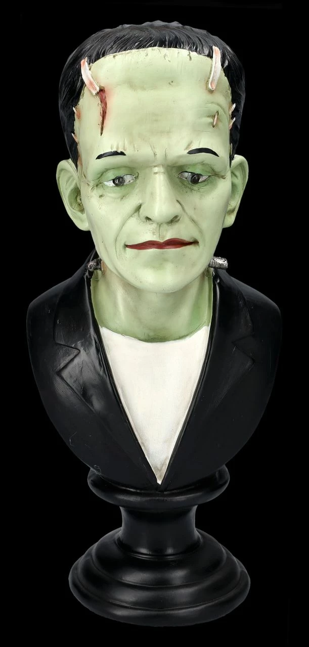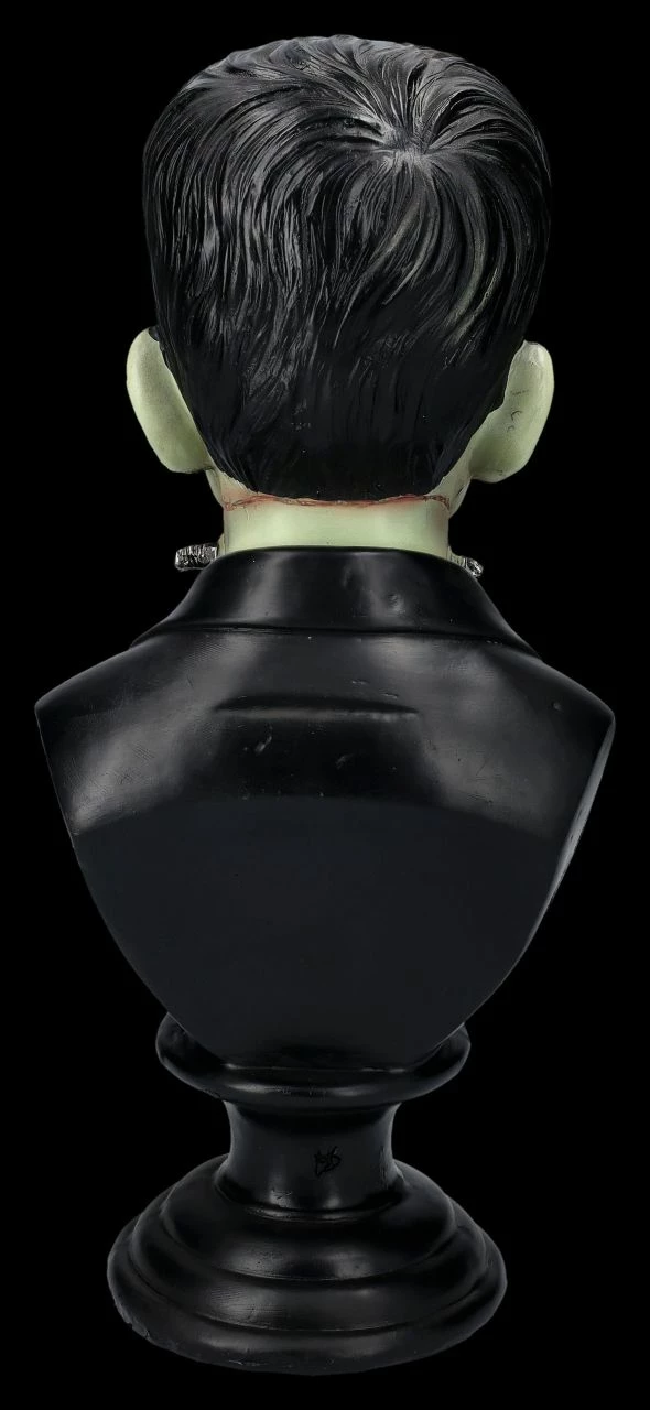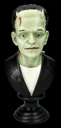 Frankensteins Monster ist unglücklich und deprimiert und das sieht man dieser detailreich aus handbemaltem Kunststein (Polyresin) gefertigten Skulptur auch an. Aber nicht nur das – durch die batteriebetriebene LED-Beleuchtung ist nicht nur das Gesicht grün, sondern im Dunkeln leuchten auch noch die Augen grün. Die 35 cm hohe, 16 cm breite und 12,5 cm tiefe Skulptur mit dem Kopf von Frankensteins Monster ist eine wirklich ungewöhnliche Deko, bei der es viel zu schade ist, wenn sie nur an Halloween aufgestellt wird. Für die LED-Beleuchtung werden 2 x LR44 Batterien benötigt, die nicht in der Lieferung enthalten sind.