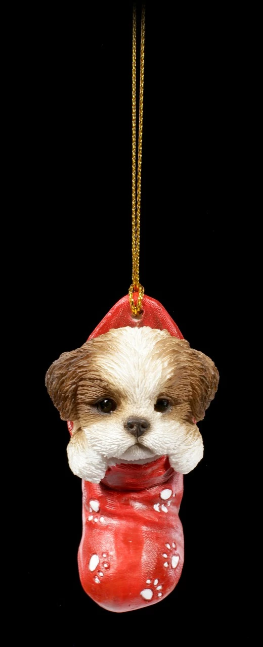 Der kleine Shih Tzu Welpe betrachtet neugierig seine Umgebung während er gemütlich in einem Weihnachtsstrumpf sitzt. Mit diesem äüßerst niedlichen Christbaum Schmuck Anhänger können Sie einem Shih Tzu Liebhaber eine große Freude machen.