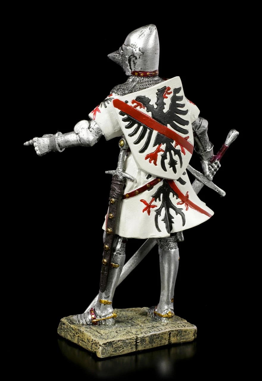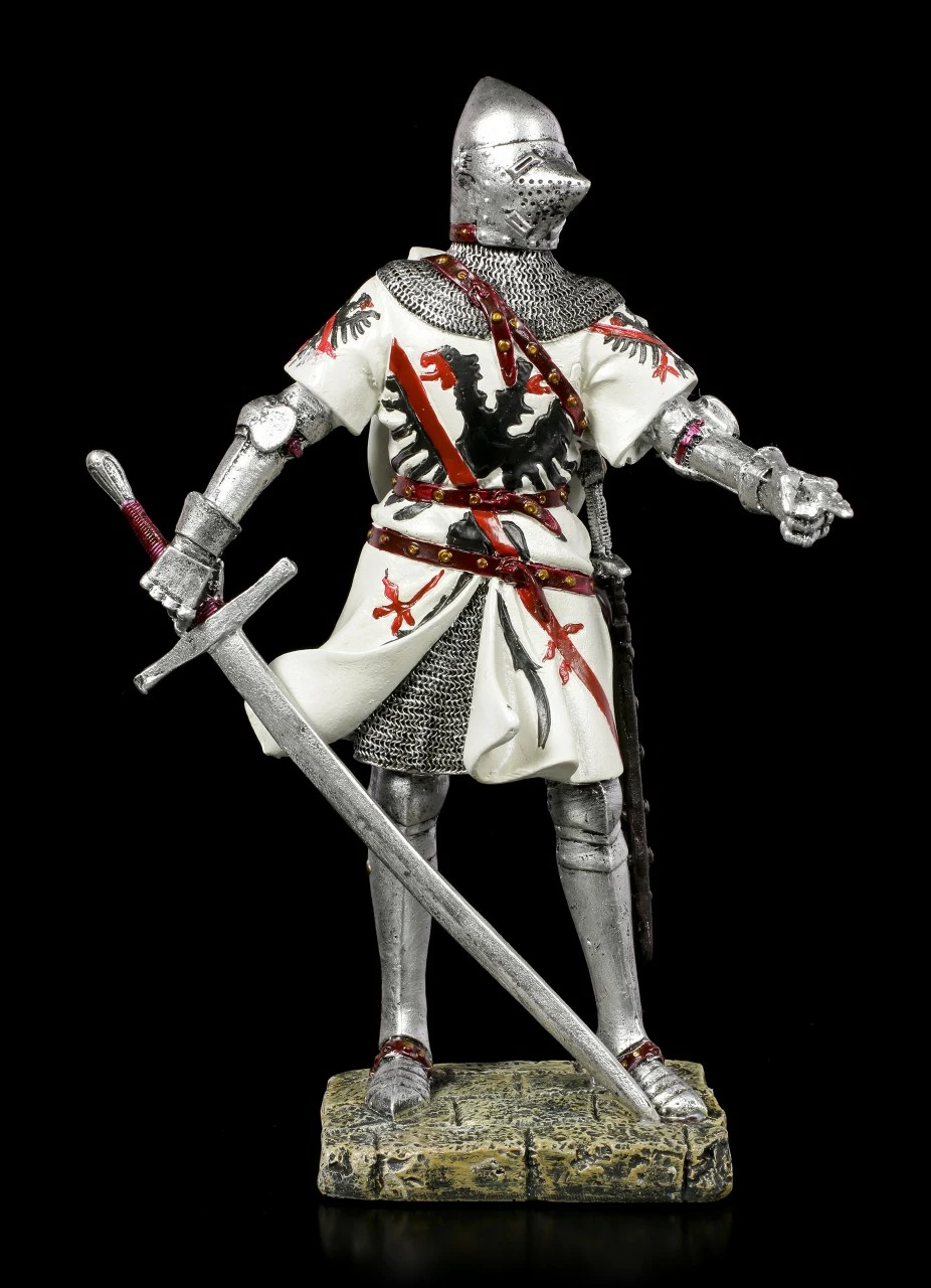 Der handbemalte Ritter aus Kunststein (Polyresin) hat das Schwert leicht erhoben und holt zum Schlag aus. Er trägt eine Beckenhaube und einen reich verzierten Umhang über der Rüstung. Die 19 cm große Kreuzritter Figur ist ein wunderbares Geschenk für einen Mittelalter Fan und lässt sich wunderbar mit anderen Ritter Figuren kombinieren.
