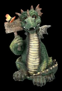 Na hallo – da freut sich bestimmt jeder Besucher, wenn er so herzlich willkommen geheißen wird! Der lustige grüne Drache mit dem ‚Welcome‘ Schild, auf dem sich ein bunter Schmetterling niedergelassen hat, wird sicher jedem sofort ein Lächeln entlocken. Der 18,5 cm hohe, 13 cm breite und 13 cm tiefe Drache mit dem Willkommen-Schild wurde detailreich aus Kunststein (Polyresin) gefertigt und von Hand bemalt. Er sollte direkt im Eingangsbereich aufgestellt werden, damit er Ihre Besucher freundlich empfangen kann, ist aber auch ein perfektes Geschenk für alle Drachen-Freunde.