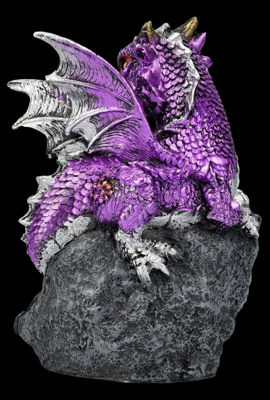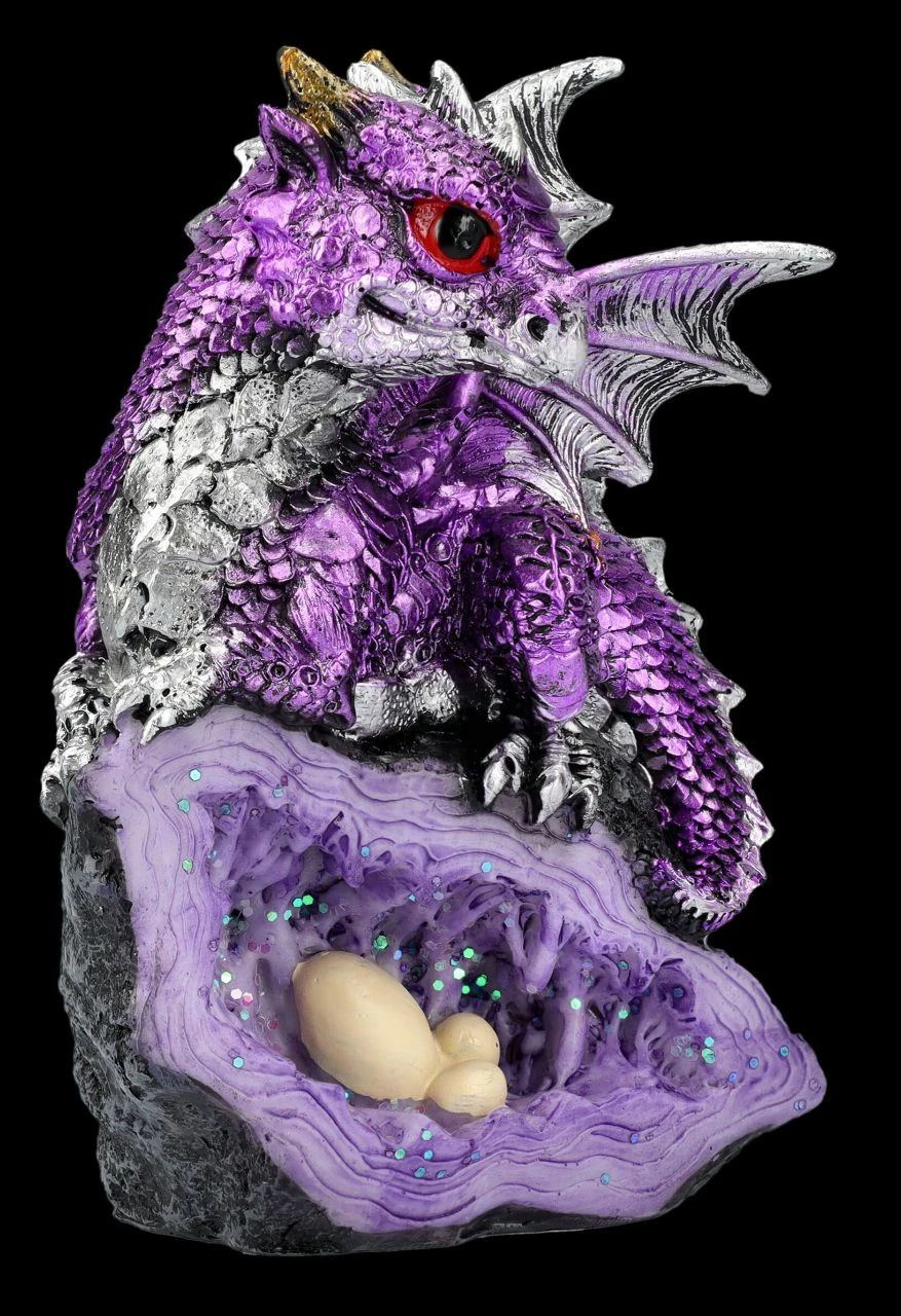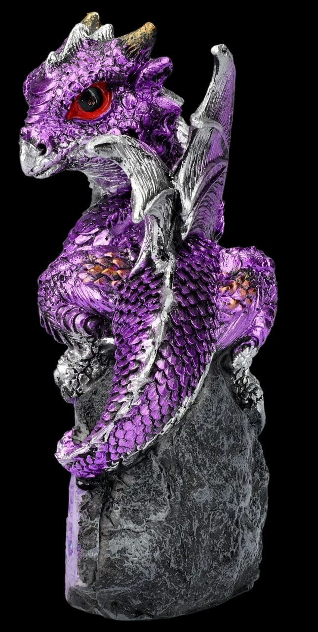 Lilafarbene Drachen sind ja sehr selten, daher müssen die Eier sehr gut vor Nesträubern versteckt werden. In der lilafarbenen Kristallhöhle wurden von der Drachenmutter drei Dracheneier abgelegt, die nun von dem kleinen lilafarbenen Drachen bewacht werden. Der lilafarbene Wächter auf der Kristallhöhle ist 13 cm hoch, 9,5 cm breit und 6 cm tief. Die Drachenfigur aus liebevoll handbemaltem Kunststein (Polyresin) ist – vielleicht auch gleich mit dem grünen und dem dunkelblauen Wächter aus unserem Shop – ein perfektes Geschenk für Drachen-Freunde.