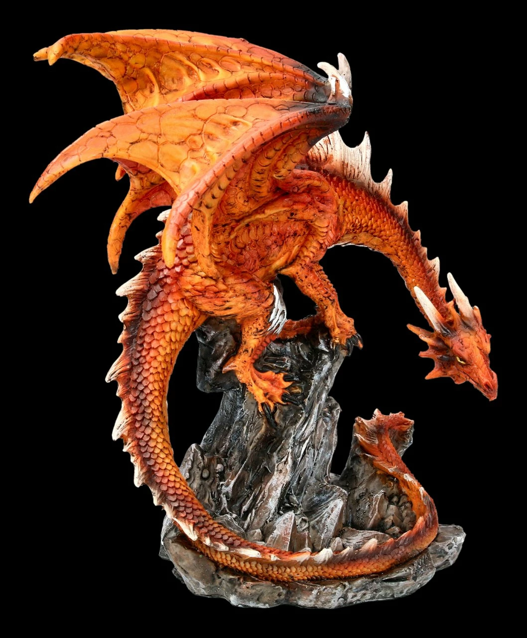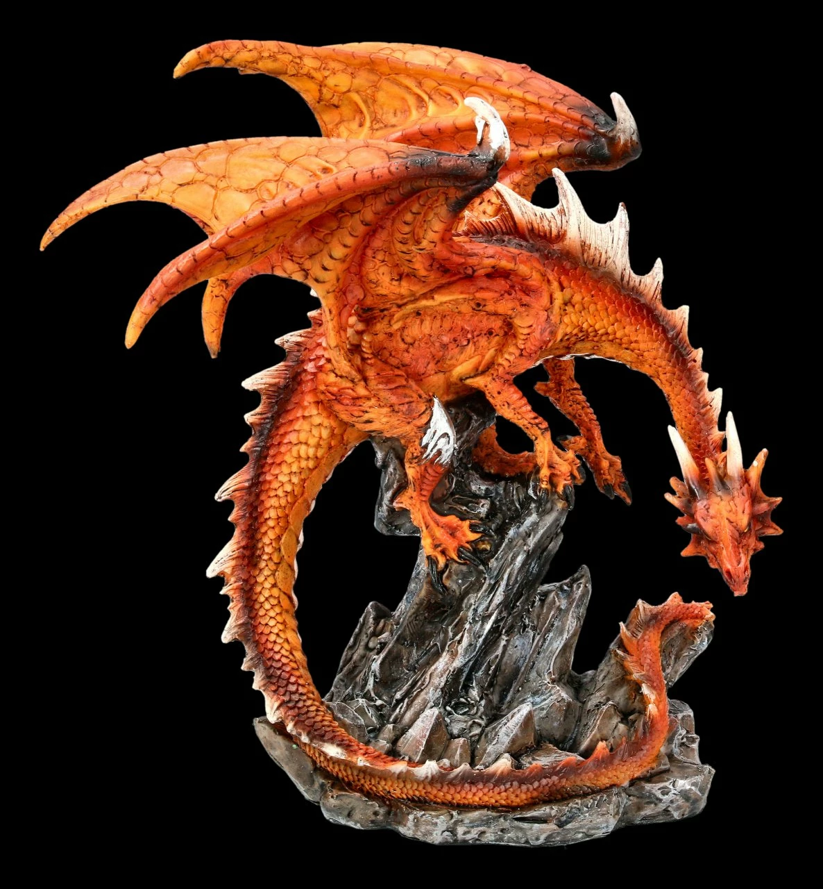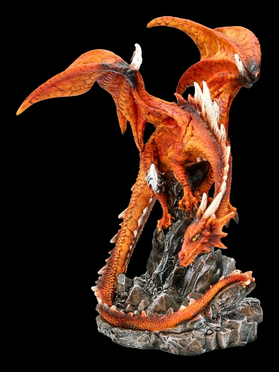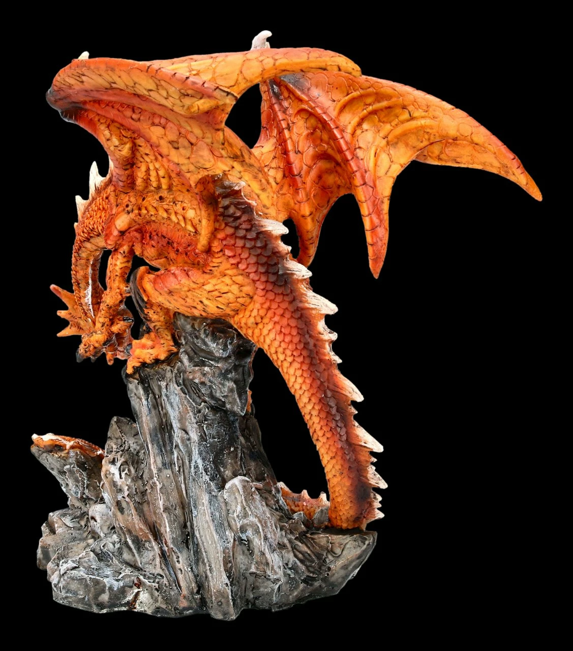 Mikan der Feuerdrache ist auf einer Felsenspitze gelandet und erkundet, bevor er wieder startet, das Terrain. Der leuchtend rote Feuerdrache in der Felsenlandschaft ist aus sehr detailreich handbemaltem Kunststein (Polyresin) gefertigt. Er ist 21 cm hoch, 20,5 cm breit und 15,5 cm tief. Mit seiner feuerroten Farbe bildet er einen leuchtenden Blickpunkt in Ihrer Wohnung.