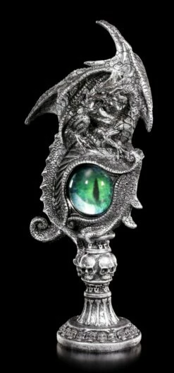 Silberfarbene Drachenfigur bewacht grünes Auge