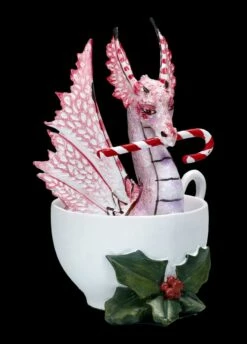 Na, da hat sich der kleine Drache mit der Zuckerstange zwischen den Zähnen den richtigen Platz ausgesucht, um auf Weihnachten zu warten. Denn aus der Tasse mit dem Ilexblatt wird so schnell nicht einmal ein Pfefferminztee getrunken werden können. Die lustige Drachen Figur Perfectly Peppermint aus liebevoll handbemaltem Kunststein (Polyresin) ist 14 cm hoch, 9,5 cm breit und 9 cm tief. Sie ist nicht nur für Drachenfreunde ein witziges Geschenk.