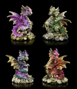 Verschenken Sie einen kleinen Glücksbringer, der dann für Geldsegen sorgen soll. Das süße bunte Drachen 4er Set aus Kunststein (Polyresin) ist liebevoll handbemalt. Jeder Drachenkenner weiß, dass Drachen einen Hort voller Edelsteine, Geld und andere Kostbarkeiten besitzen und diese vier süßen Drachen haben es sich jeweils auf einem Berg des Geldes bequem gemacht.
