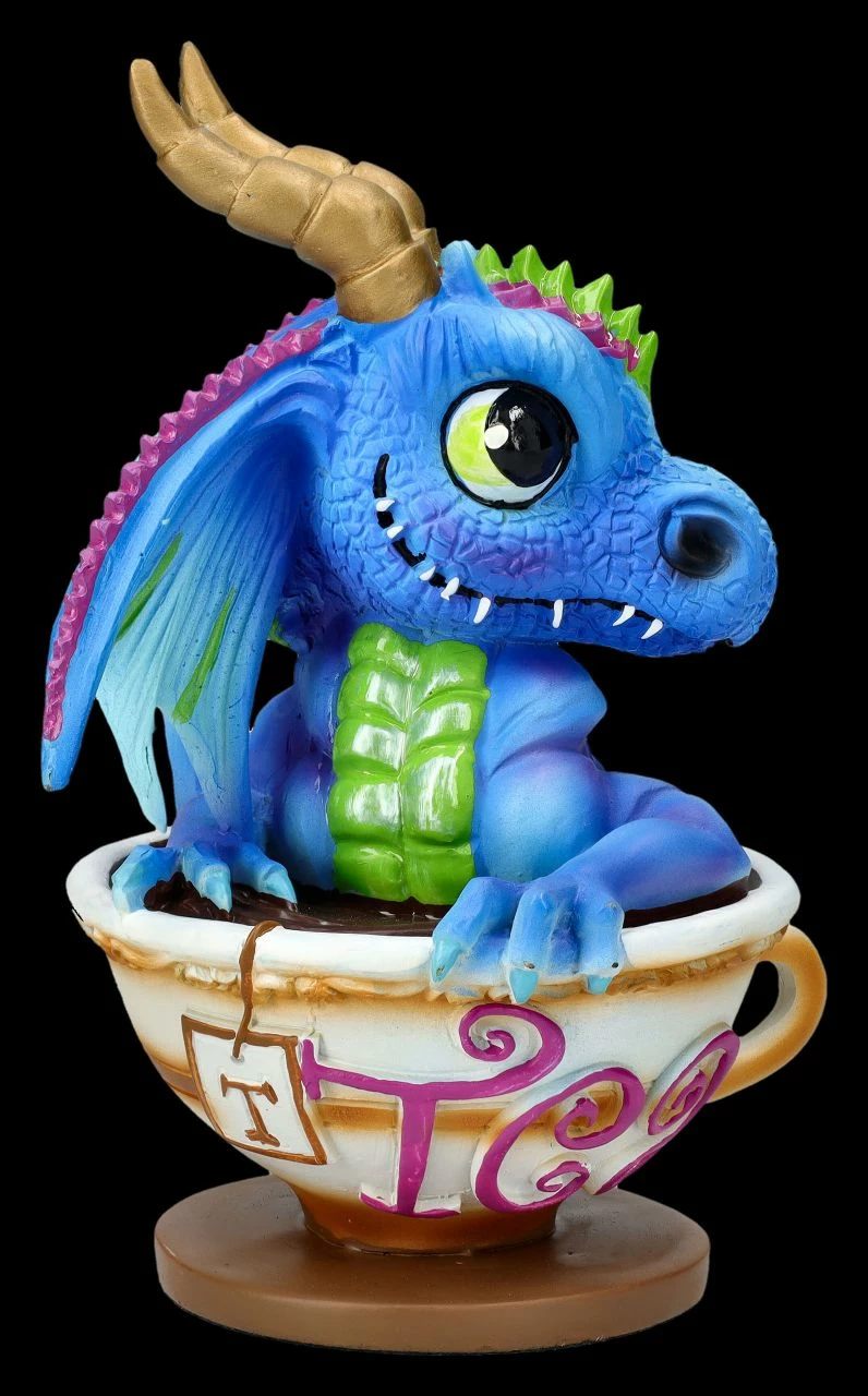 ‚Tea Sir, Mylady?‘ Nun ja, als Butler ist Tom eher nicht geeignet, wenn er so frech selbst erst mal einen Schluck vom Tee nehmen möchte. Dazu hätte sich nicht gleich selbst in die Tasse setzen sollen, denn nun wurde er erwischt. Die beliebte Fantasykünstlerin Ruth Thompson hat den kleinen bunten Drachen, der etwas frech aus der Tasse mit dem Schriftzug ‚Tee‘ schaut, einfach perfekt getroffen. Die lustige, liebevoll von Hand bemalte Drachenfigur Tom in der Tee-Tasse aus Kunststein (Polyresin) ist 13,5 cm hoch, 10 cm breit und 9,5 cm tief. Zur Teatime, am Frühstückstisch oder auch im Büro auf dem Schreibtisch, der Drache Tom verbreitet sofort gute Laune und ist daher auch ein witziges Geschenk. In unserem Shop gibt es noch weitere lustige Drachen von Ruth Thompson in den unterschiedlichsten Tassen.