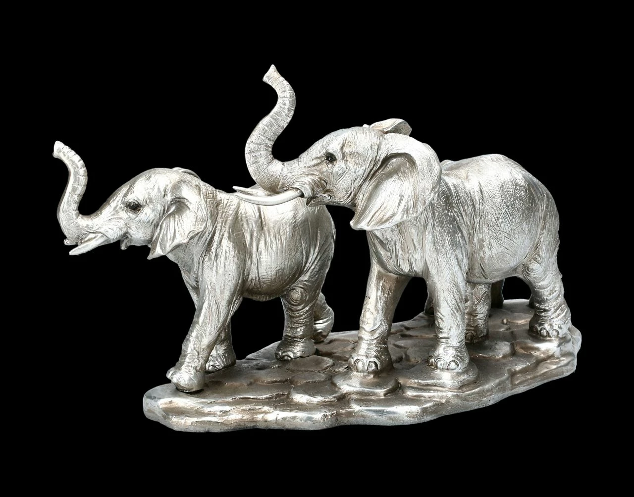 Elefanten gelten in vielen Kulturen als Glücksbringer. Sie sind allgemein gesellige Tiere und leben meist in großen Familienverbänden mit einer besonders engen Bindung zwischen Elefantenmüttern und ihren Kindern. Diese Figurengruppe aus Kunststein (Polyresin) im antiken Silber-Finish zeigt eine lustig und glücklich trompetende Elefantenfamilie. Äußerst detailreich dargestellt, steckt sie jeden mit ihrer Fröhlichkeit an. Mit ihrer Höhe von 17,0 cm, einer Breite von 30,0 cm und einer Tiefe von 14,0 cm ist sie mit ihrem edlen antik aussehendem Silber-Finish ein wunderbares Geschenk für Freunde und Familie.