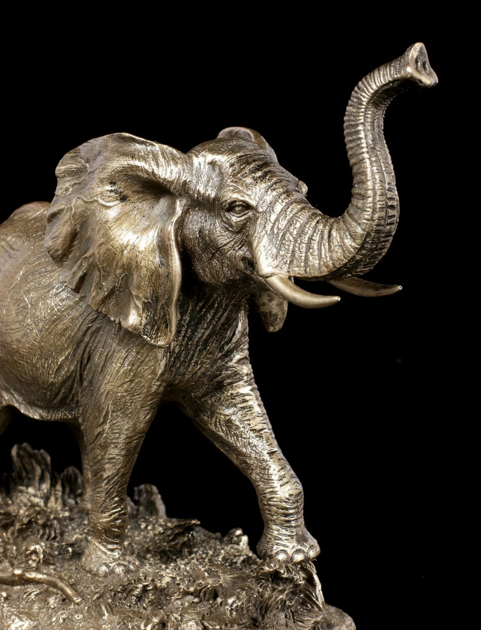 Mit erhobenen Rüssel stürmt der majestätische Elefant über die Steppe. Was er wohl gesehen hat? Seine Familie? Oder einen Fluss? Die bronzierte Elefantenfigur stammt aus der Serie ‚Ode to Wildlife‘ von Veronese und ist eine Hommage an die majestätischen Dickhäuter.