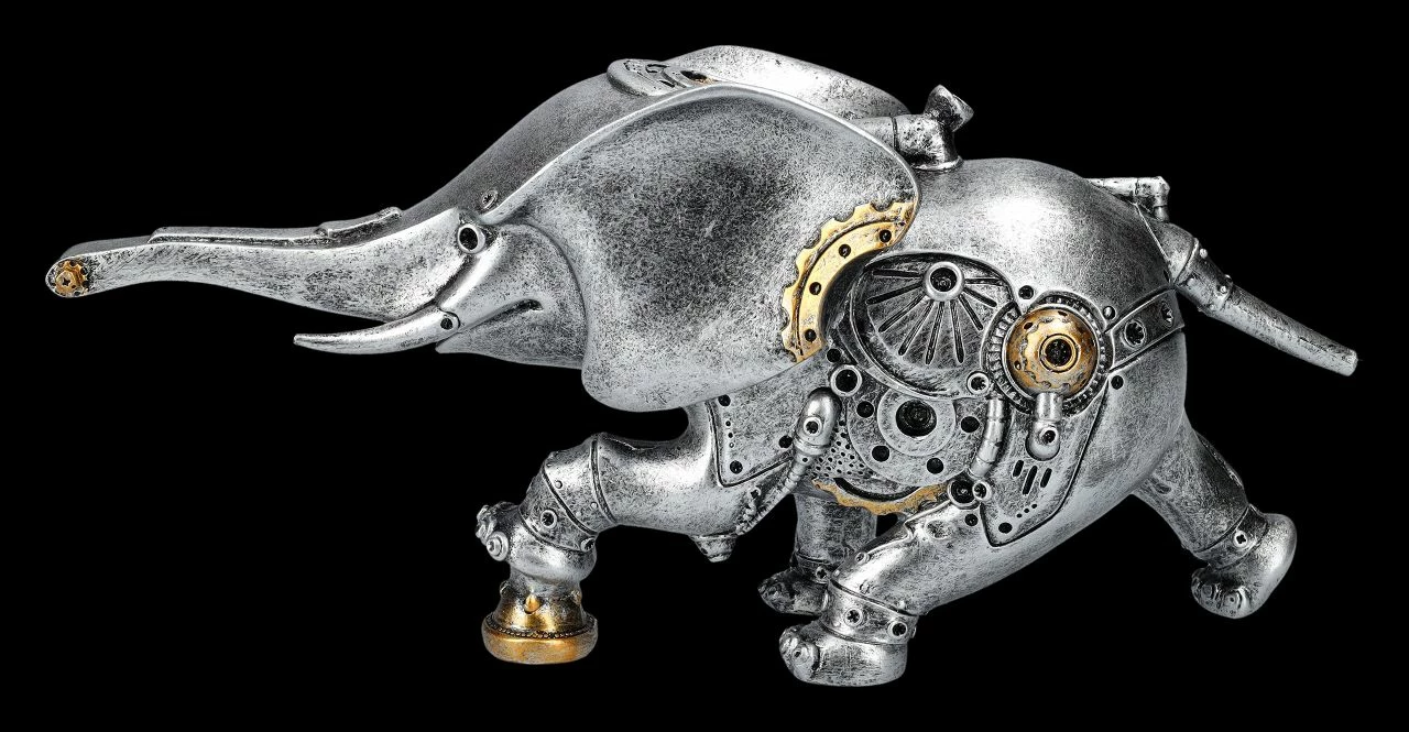 Als würden ihn die Räder antreiben, ist er mit flotten Schritten unterwegs, der außergewöhnliche Steampunk Mechanical Mammal. Der faszinierende Elefant aus handbemaltem Kunststein (Polyresin) wirkt wie aus verschiedenen Metallen und technischen Rädern angefertigt. Mit der Höhe von 14 cm, der Breite von 31 cm und der Tiefe von 10 cm ist er eine sehr interessante Deko und ein toller Blickfang.