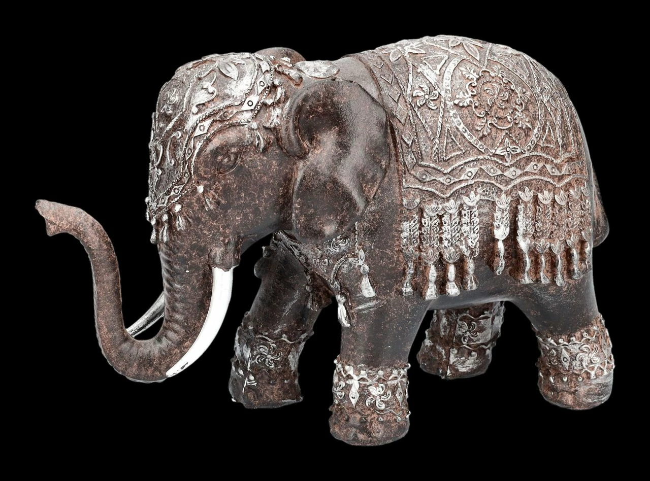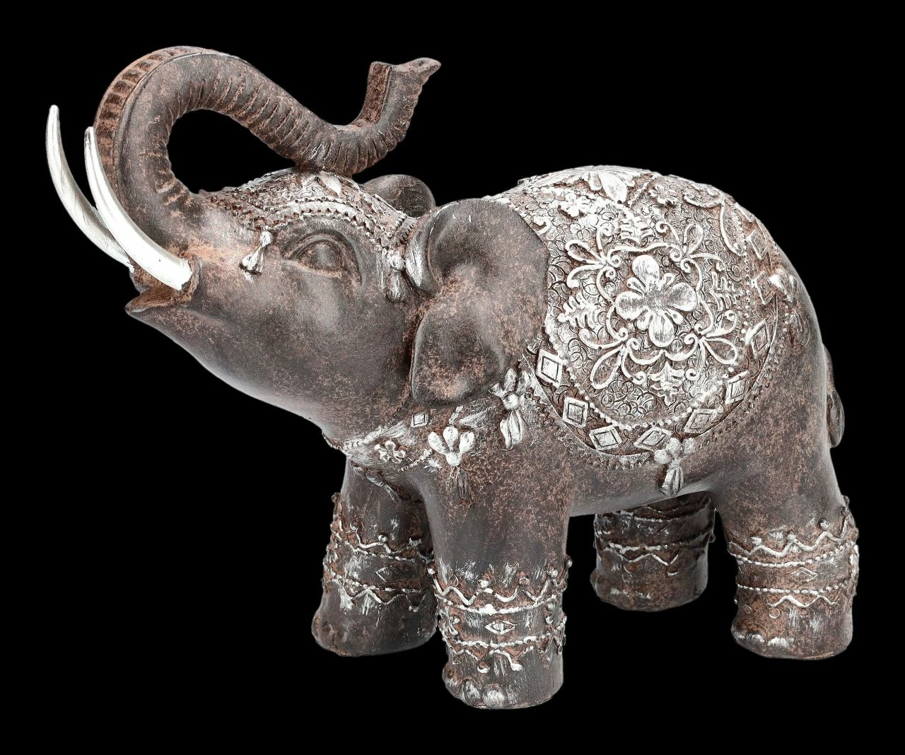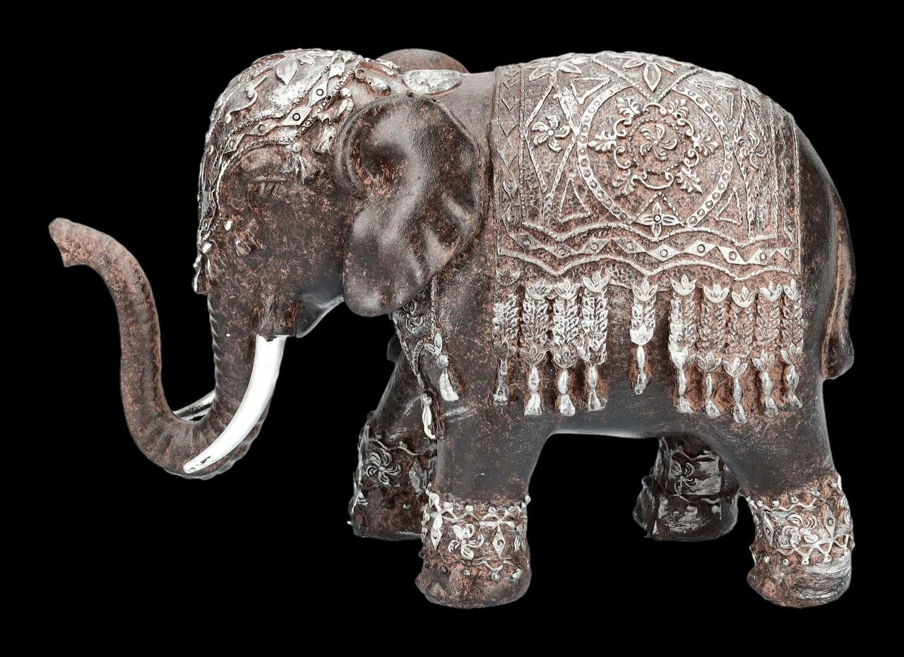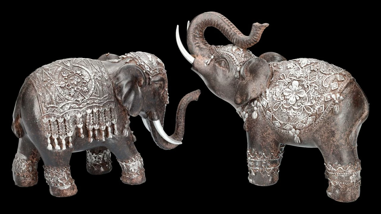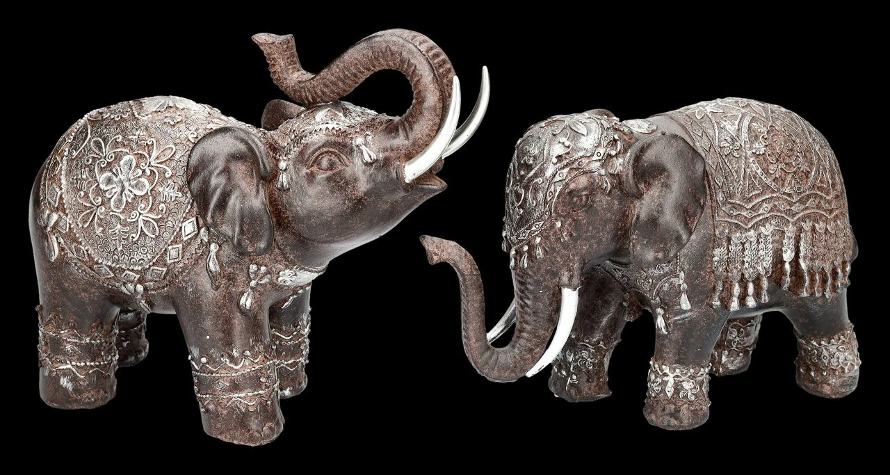 Die beiden indischen Elefanten sind das perfekte Geschenk zur Hochzeit, denn schließlich gelten Elefanten als Symbol für Treue, Klugheit, Stärke und Güte. Elefanten sind mittlerweile nicht nur in Asien und Afrika als Glücksbringer beliebt. Als Glückssymbol für Reichtum und Wohlstand sind sie damit auch als Geschenk zum Einzug ins neue Heim besonders gut geeignet. Auch im Feng Shui werden sie gerne eingesetzt, da sie den Schlaf positiv beeinflussen sollen. Außerdem sind die beiden braunen indischen Elefanten aus Kunststein (Polyresin) mit den gemusterten Decken durch die zarte Handbemalung auch sehr hübsch anzusehen. Mit der Höhe von 15,5 – 19 cm, der Breite von je 8,5 cm und der Tiefe von je 20 cm sind sie ein sehr dekoratives Element auf dem Sideboard oder der Fensterbank.