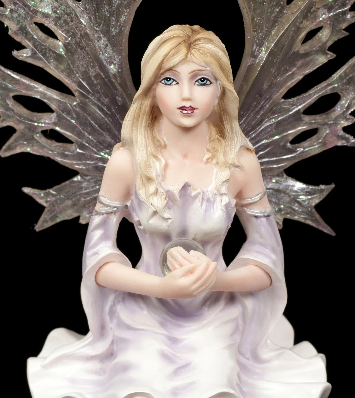 Die Elfe Fermion hält ihre Glaskugel fest in ihren Händen. Mit dieser schönen Kugel kann sie in die Zukunft blicken und sich oft Rat holen. Die wunderschöne filigrane Elfe wird zu dem Highlight in Ihrer Elfen Sammlung und ist ein schönes Geschenk an einen lieben Menschen.