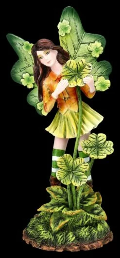 Hinter einem vierblättrigen Kleeblatt schaut neckisch die niedliche Glücksfee Indis hervor. Mit ihren Kleeblatt-Flügeln ist sie doch ein ganz bezaubernder Glücksbote und mit ihren grün geringelten Strümpfen schaut sie doch absolut niedlich aus. Die Flügel der 20,5 cm hohen, 10 cm breiten und 9,5 cm tiefen Elfenfigur aus liebevoll handbemaltem Kunststein (Polyresin) sind zum Stecken. Glück ist relativ und hat für jeden eine andere Bedeutung und es gibt zahlreiche Symbole. Ein vierblättriges Kleeblatt ist aber für viele ein wichtiges Glückssymbol – und das sicher nicht nur zu Neujahr. Daher ist die Glücksfee Indis doch ein perfektes Geschenk für alle, denen Sie Glück wünschen möchten.