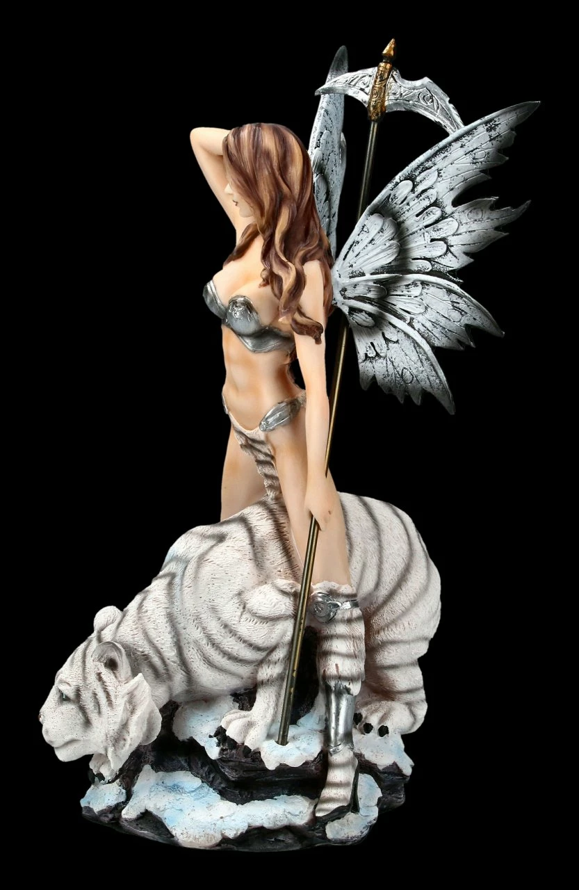 Wer stellt sich nicht manchmal vor, wie diese wunderschöne Elfen Kriegerin wilde Abenteuer zu bestehen. Lediglich mit einem metallenen Brustpanzer geschützt und mit einem Lendenschurz und Gamaschen aus Tigerfell bekleidet, reitet die leidenschaftliche schöne Kriegerin auf ihrem weißen Tiger und hält bereits ihre Hände an der 32 cm langen und 8 cm breiten Sense, die sie auf ihrem Rücken trägt. Eine eindrucksvolle und erotische Elfen Figur, die sehr detailreich aus Kunststein (Polyresin) gefertigt wurde und bis zum zarten Hautton, dem faszinierenden Gesichtsausdruck, dem langen braunen Haar, der Bekleidung und den metallicfarbenen Flügeln (die Flügel sind zum Stecken) sehr fein von Hand bemalt ist. Die schöne Kriegerin mit weißem Tiger ist mit der Höhe von 36 cm, der Breite von 19,5 cm und der Tiefe von 20 cm eine sehr sinnliche Dekoration und auch ein wunderbares Geschenk.