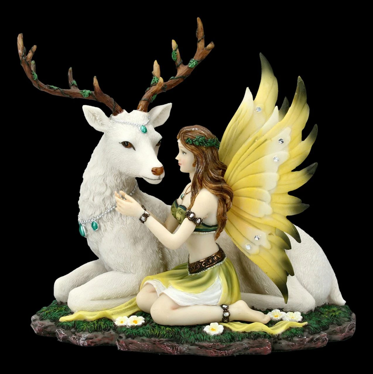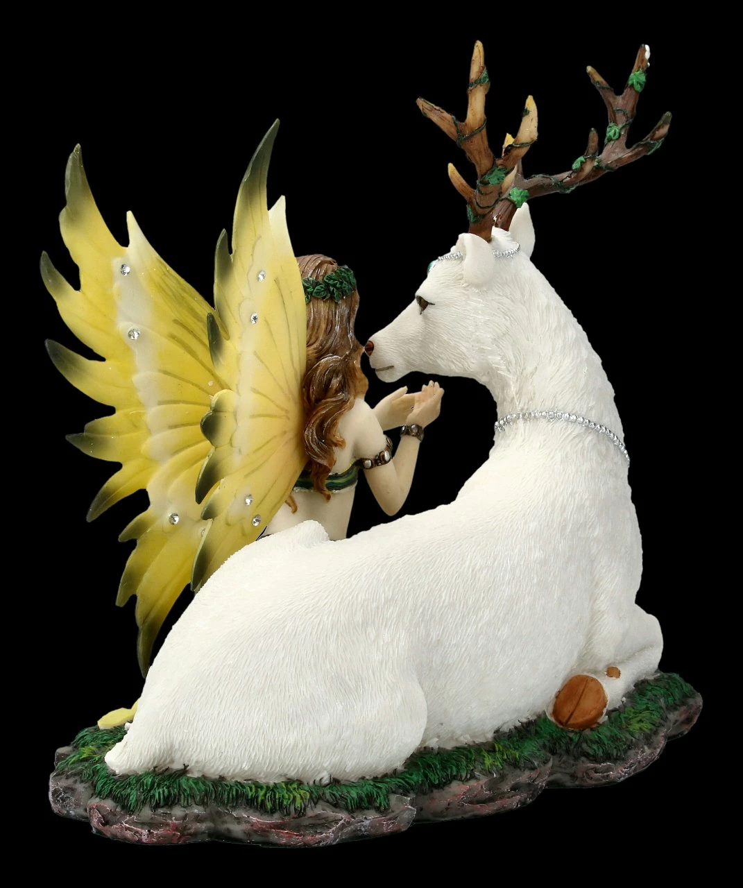 Liebevoll kümmert sich die hübsche Elfe um den König der Wälder, einem stattlichen weißen Hirsch. Ihr gelb-weißes Kostüm lässt sie sinnlich und zugleich zart wirken und harmoniert hervorragend mit ihren gelben, mit kleinen glänzenden Schmucksteinen verzierten Flügeln. Die Elfe und der weiße Hirsch sind nicht nur für die herbstliche Jahreszeit eine schöne Dekoration in Ihrer Wohnung.