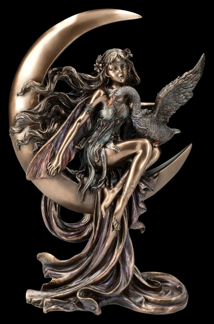 Die entzückende Mondelfe ist mit ihrem Freund, dem großen Schwan, um die Wette geflogen und hat gerade ihren Aussichtsplatz auf dem Mond eingenommen. Ihre langen Locken flattern noch durch den stürmischen Flug und da landet auch schon der schöne Schwan auf ihren nackten Knien. Bis zu den feinen Gesichtszügen der bezaubernden Elfe, den mit Blüten geschmückten langen Locken und dem fließenden Kleid, das wie ein Nebel weit über die Mondsichel bis auf den Boden reicht und dem schönen Schwan mit den großen Flügeln ist diese faszinierende Elfen-Figur aus der Studio Collection von Veronese wunderschön und detailreich aus hochwertigem Kunststein (Polyresin) gefertigt. Durch die edle Bronzierung und sehr feine und abgestimmte Colorierung wirkt diese zauberhafte Elfenskulptur beinahe wie eine Arbeit aus der Jugendstilzeit. Die 24,5 cm hohe, 16 cm breite und 10 cm tiefe entzückende Elfe mit dem Schwan auf dem Mond ist ein wahres Schmuckstück in jedem Ambiente. Die zauberhafte Mondelfe ist für jeden Sammler und für alle, die die fantasievolle Welt der Elfen lieben, ein wunderschönes Geschenk.