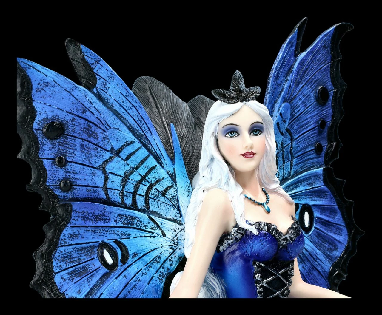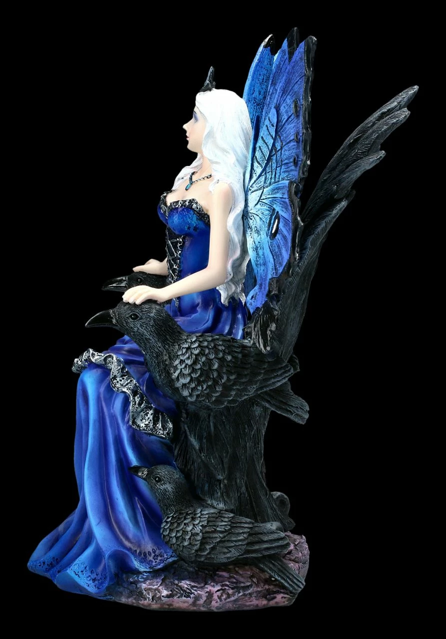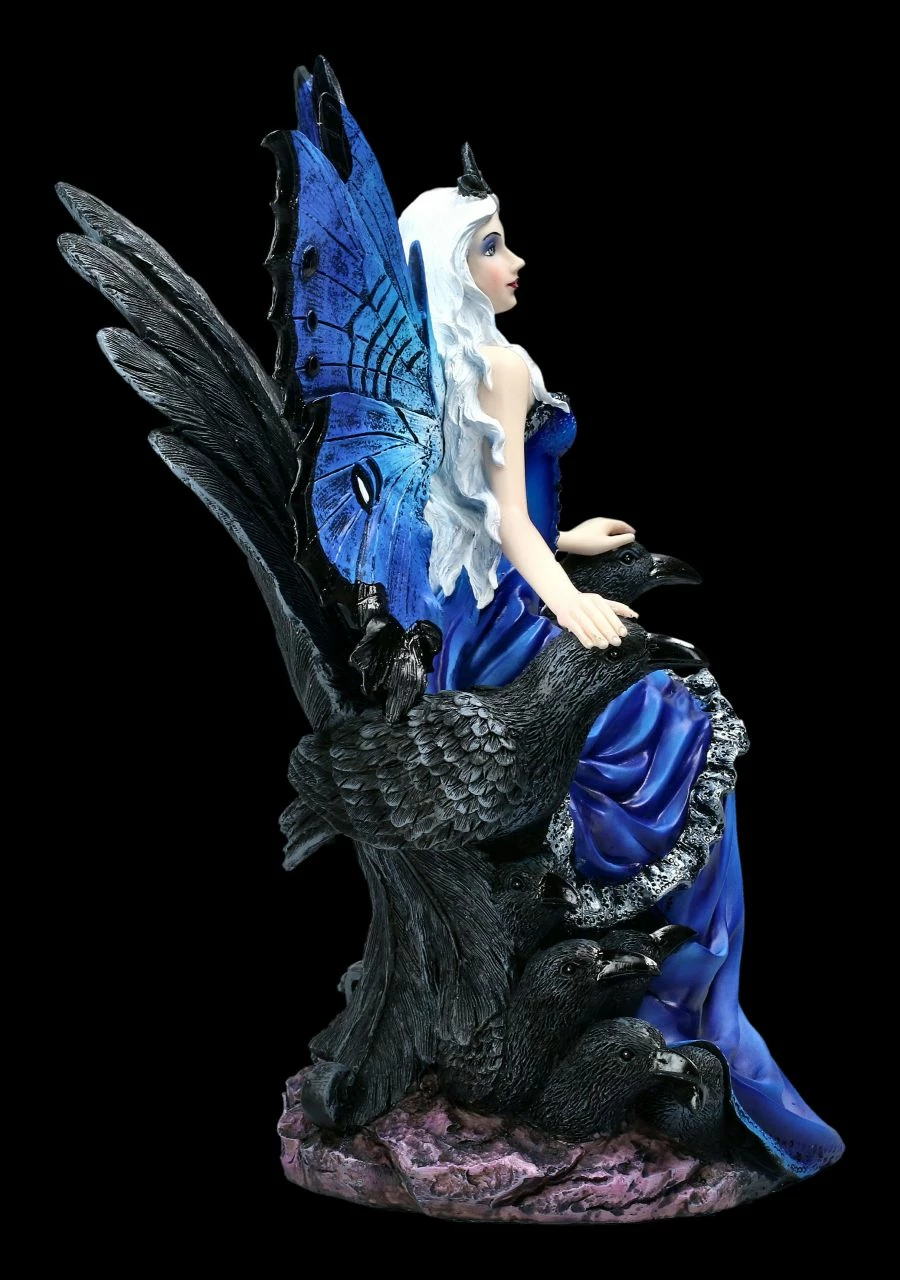 Stolz, in ein nachtblaues Kleid gehüllt, sitzt die Rabenkönigin auf ihrem Thron. An den beiden Seiten der beeindruckenden Rabenkönigin sitzen ihre Gefährten, auf die sie sanft ihre Hände legt. Zu ihren Füßen sitzen die jungen Raben. Hinter den zart gemusterten blauen Flügeln der schönen Elfe ist das Rabengefieder zu sehen. Die Rabenkönigin ist ausserordentlich detailreich aus sorgfältig handbemaltem Kunststein (Polyresin) gefertigt. Sie ist 29,0 cm hoch, 17,0 cm breit und 20,0 cm tief. Die kunstvoll gemalten Flügel der Elfe sind zum Stecken.