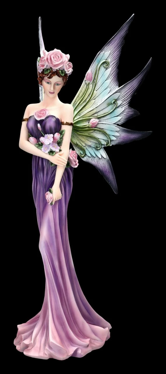 In jedem Jahr wird zu Beginn der Blütenzeit der Rosen eine der Elfen zur Rosenkönigin gekürt. In diesem Jahr ist es Prinzessin Violetta, die von allen Wesen im Elfenreich ausgewählt wurde und bei allen Feierlichkeiten im Elfenreich mit Rosen geschmückt wird. Erst am Ende der Blütenzeit der Rosen wird sie von ihren Aufgaben befreit und darf mit ihren Elfenschwestern wieder unbeschwert durch die Wälder der Fantasie streifen. Beinahe kann man den Duft der Blüten erschnuppern, wenn man die wunderschöne Elfe Violetta in ihrem seidig fallenden violetten Kleid mit ihren schönen, wie herrliche Blütenblätter wirkenden Flügeln, die zum Stecken sind, sieht..Die wunderbar zarte Fee Violetta als Rosenkönigin ist beeindruckende 57,5 cm hoch, 24 cm breit und 23 cm tief. Sie wurde aus liebevoll handbemaltem Kunststein (Polyresin) gefertigt und ist auch ein fantastisches Geschenk für jeden, der von der mystischen Welt der Elfen begeistert ist und auch für jeden, der die Blüten und den Duft der herrlichen Rosen liebt.