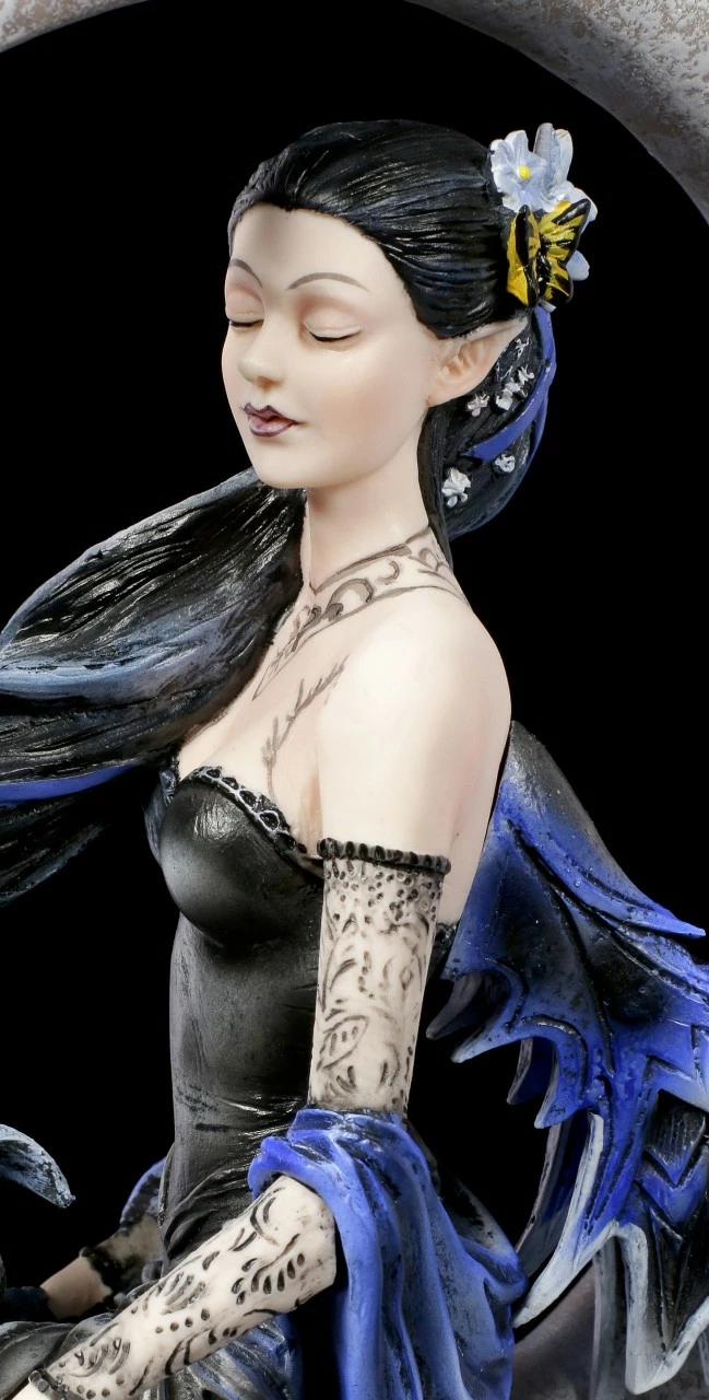 In eleganter Haltung sitzt die schöne Elfe Solace Elfe auf dem Halbmond und schaut andächtig in die Ferne. Es sieht aus, als würde sie auf ihren Liebsten warten, der sie zu einem Moonlight-.Ball abholt. Das Kleid von Solace ist wie der Nachthimmel mit Sternen designt und die schönen, detailreichen Flügel können mit einer Magnethalterung befestigt werden. Die wunderschöne Elfe von Nene Thomas aus fein handbemaltem Kunststein (Polyresin) wird in einer Geschenkverpackung geliefert und ist ein tolles Geschenk an einen Sammler.