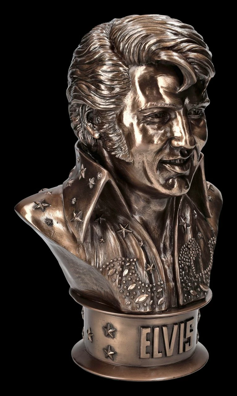 Nur 42 Jahre alt ist er geworden, als er am 16. August 1977 in Memphis starb und seine Grab ist bis heute eine wahre Kultstätte, obwohl manche Fans nicht an seinen Tod glaubten und viele Mythen ihn bis heute leben lassen. Elvis The King! Am 8. Januar 1935 geboren, hat seine Musik bis heute seine Fans und in Gedanken sehen wir ihn immer noch mit seinem kleinen Lächeln in den Mundwinkeln und dem berühmten Hüftschwung. Und sein Lächeln ist bei dieser fantastischen, edel bronzierten Elvis Presley Büste aus Kunststein (Polyresin) wunderbar dargestellt. Die 33 cm hohe, 22 cm breite und 15 cm tiefe Elvis Presley Büste ist ein toller Blickfang und ein perfektes Geschenk für jeden Fan.