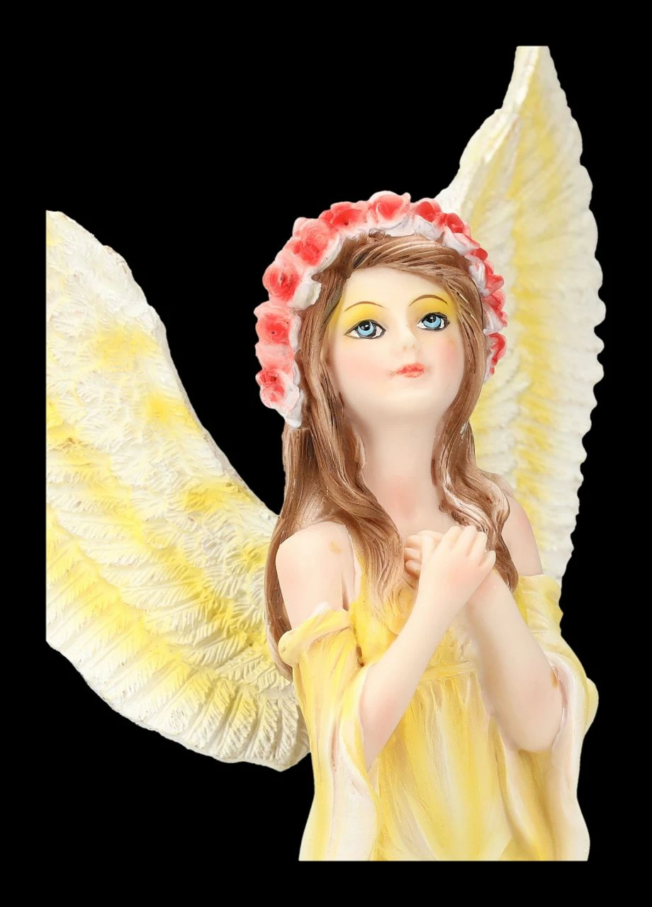 Wie von der Sonne bestrahlt, kniet der kleine Engel in dem zart gelben Kleid betend auf einer weiß-blauen Wolke. Im Haar trägt er einen Blütenkranz und die großen weißen Flügel mit den wie Sonnenstrahlen wirkenden gelben Akzenten sind weit ausgebreitet. Der 15 cm hohe, 11 cm breite und 10 cm tiefe Engel aus Kunststein (Polyresin) wurde liebevoll handbemalt. Der kleine Engel ist auch ein wunderbares Geschenk für liebe Freunde, die vielleicht einen Schutzengel benötigen, den sie auch sehen können.