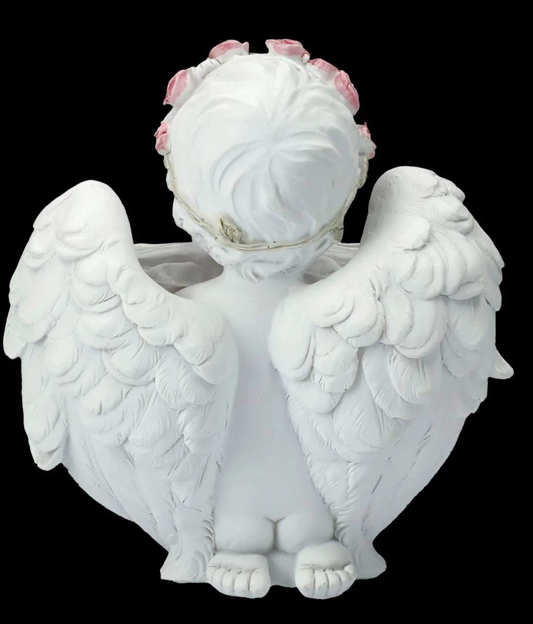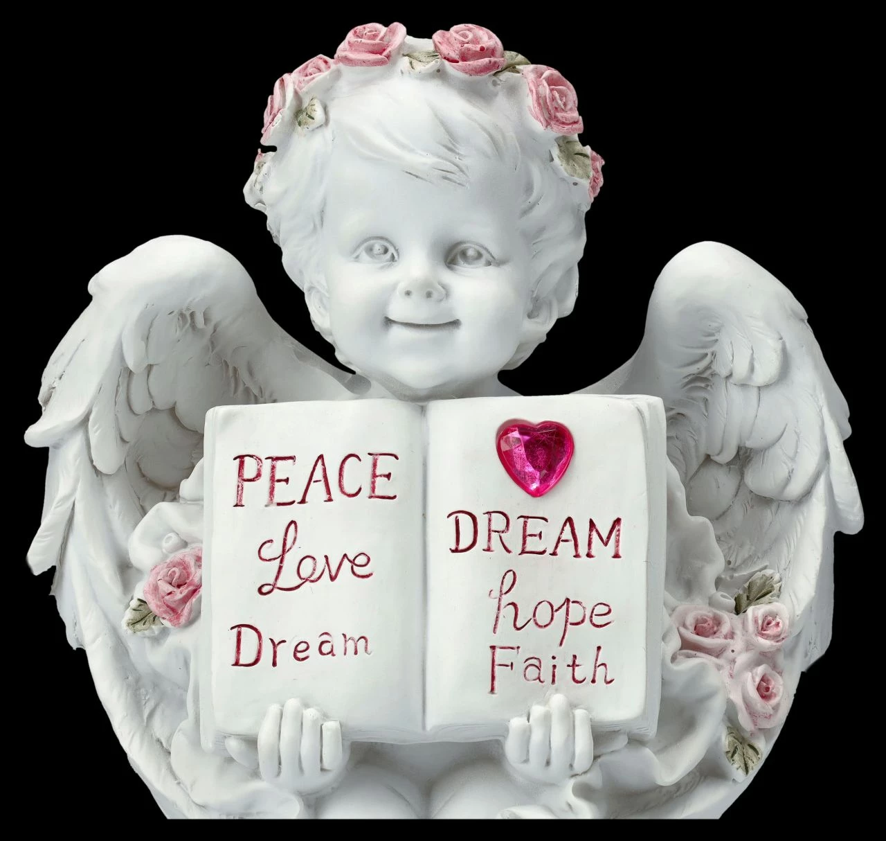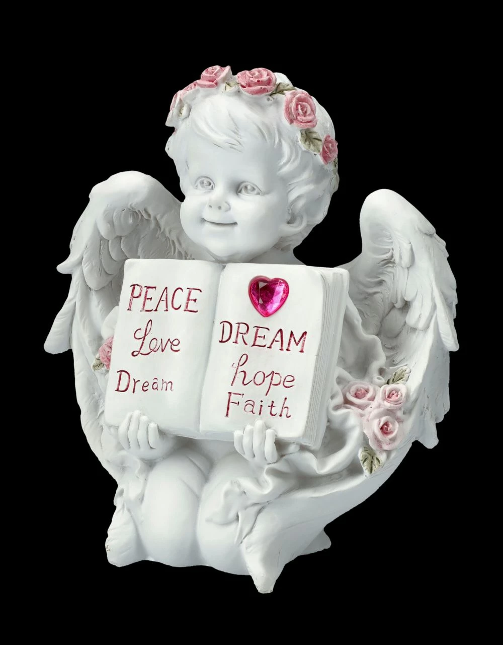 Ob mit Flügeln oder ohne – die niedlichen kleinen Putten kennt man bereits seit der Antike. Oft wurden sie als Liebesengel dargestellt, wie auch bei dieser niedlichen Engel-Figur, die mit rosa Rosen bekränzt lächelnd am Boden kniet und ein aufgeschlagenes Buch, bei dem die Worte ‚Peace, Love, Dream‘, also ‚Friede, Liebe, Traum‘ auf der einen Seite und unter einem roten Herzen ‚Dream, Hope, Faith‘, also ‚Traum, Hoffnung, Glaube‘ auf der anderen Seite steht. Die bezaubernde Engel-Figur ist aus liebevoll handbemaltem Kunststein (Polyresin) und 15,5 cm hoch, 14 cm breit und 8 cm tief. Die Putte mit Buch und Herz ist sicherlich auch ein liebevolles Geschenk, das jedem ein Lächeln entlocken wird.