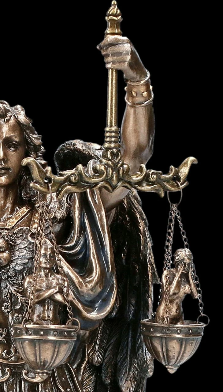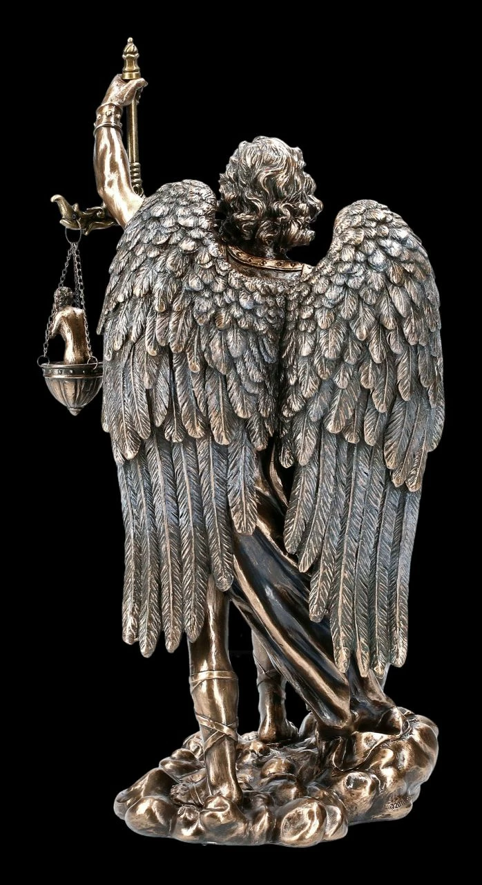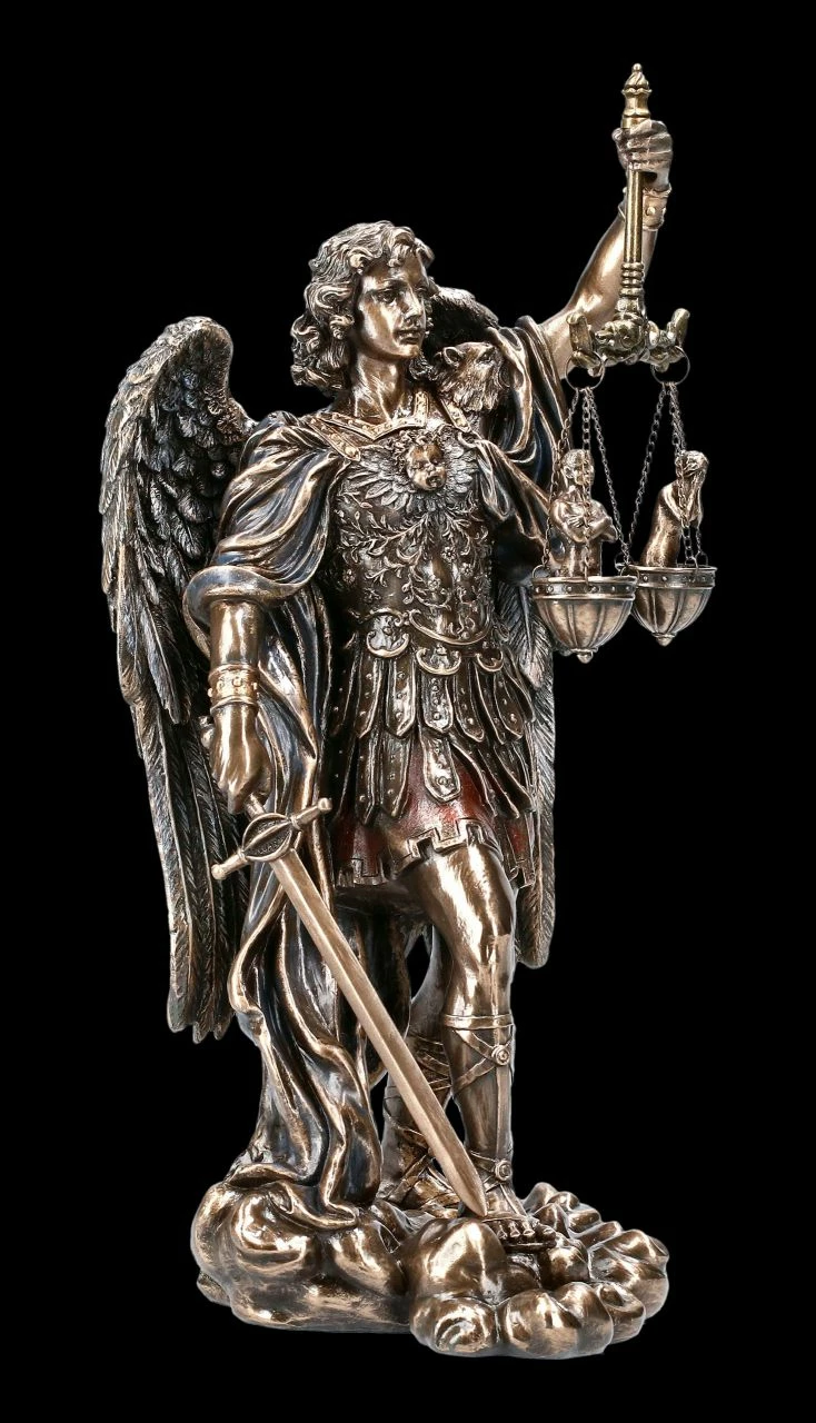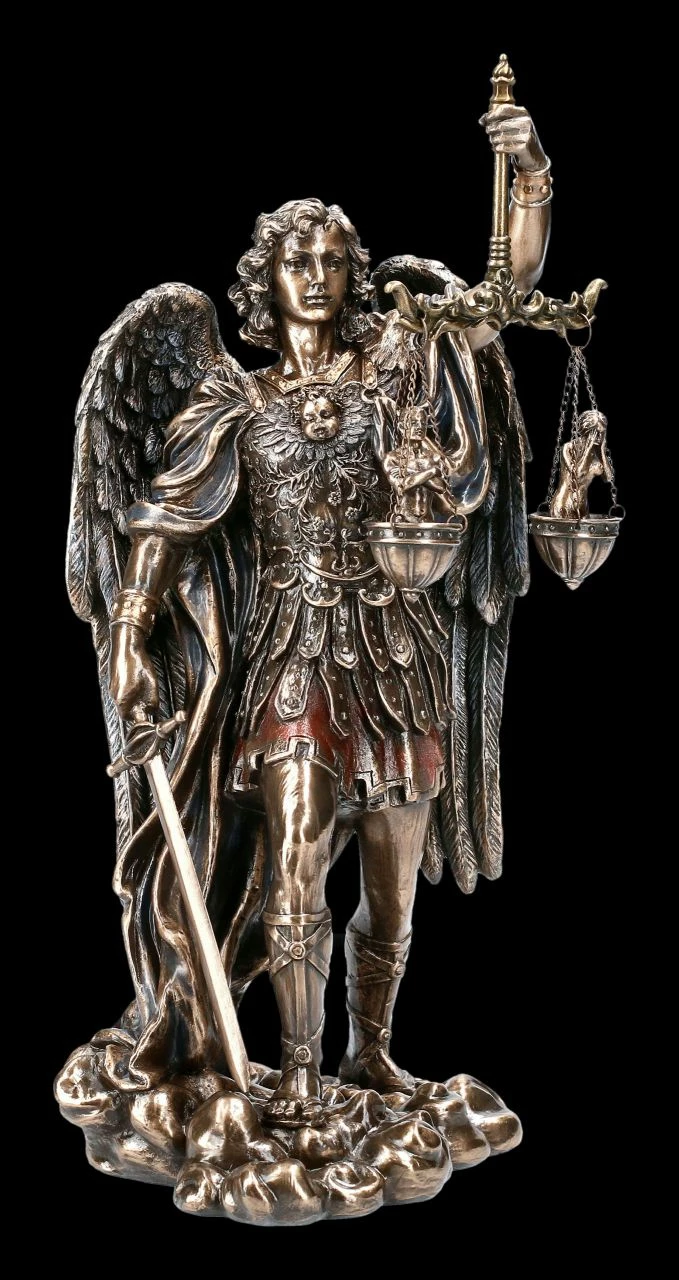 Die edle Darstellung aus der Serie ‚Studio Collection‘ von Veronese zeigt den Erzengel Michael, wie er am Tag des Jüngsten Gerichts die Seelenwaage hoch hält. In einer der Waagschalen ist der Teufel zu sehen und in der anderen eine reuige Figur. Mit den detailliert gestalteten Flügeln, dem Schwert und der Waage zum Anschrauben, ist der Erzengel Michael aus edel bronziertem und coloriertem Kunststein (Polyresin) außerordentlich detailreich dargestellt. Die im Gewand eines antiken römischen Helden edel mit Goldakzenten dargestellte Figur des Erzengel Michael ist 29 cm hoch, 13 cm breit und 15 cm tief und ist sicher ein besonderes Accessoire für den Schreibtisch oder das Regal in jedem Wohn- oder Arbeitsbereich.
