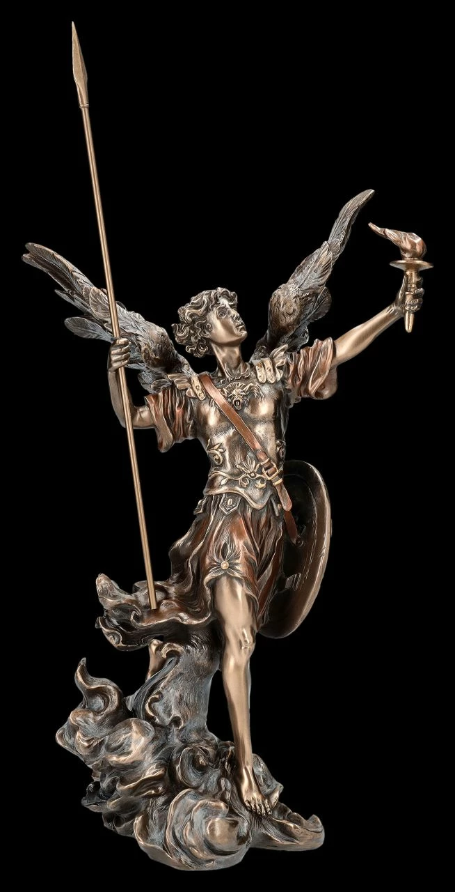 Der Erzengel Uriel ist u.a. auch der Schutzengel und Patron der Kunst und Poesie und wird als das ‚Feuer Gottes‘ bezeichnet. Er wird angerufen, Visionen in der Tätigkeit zu verstärken und zu manifestieren. In seiner rechten Hand hält Uriel bei dieser beeindruckenden Figur aus der Studio Collection von Veronese einen Speer und in seiner linken eine Fackel. Die soll zeigen, dass der Erzengel auch für ‚Gottes Licht‘ steht. Die 34,5 cm hohe (mit Speer sind es 41 cm), 21 cm breite und 13 cm tiefe Erzengel Uriel Figur mit Fackel und Speer steht auf einer lodernden Flamme. Bis zu dem feinen, empor gerichteten Gesicht, den Flügeln und der Rüstung mit dem Schild an der linken Seite, ist die bronzierte und fein colorierte Erzengel Uriel Figur detailreich aus hochwertigem Kunststein (Polyresin) gefertigt und wirkt ausgesprochen edel. Der Speer in seiner rechten Hand ist zum Stecken. Für jeden, dessen Schutzengel Uriel ist und für jeden, der die helle Kraft des Erzengels brauchen könnte, ist diese schöne Figur auch ein wunderbares Geschenk.