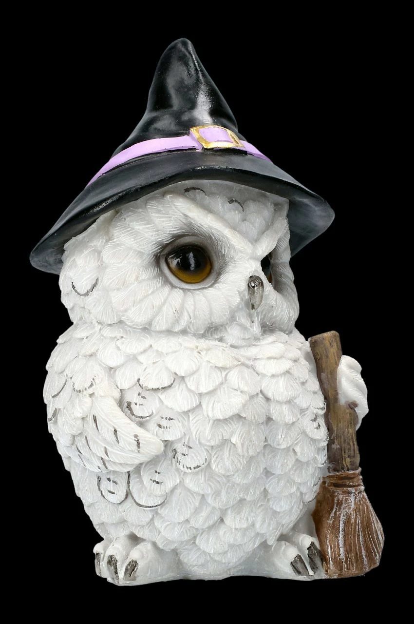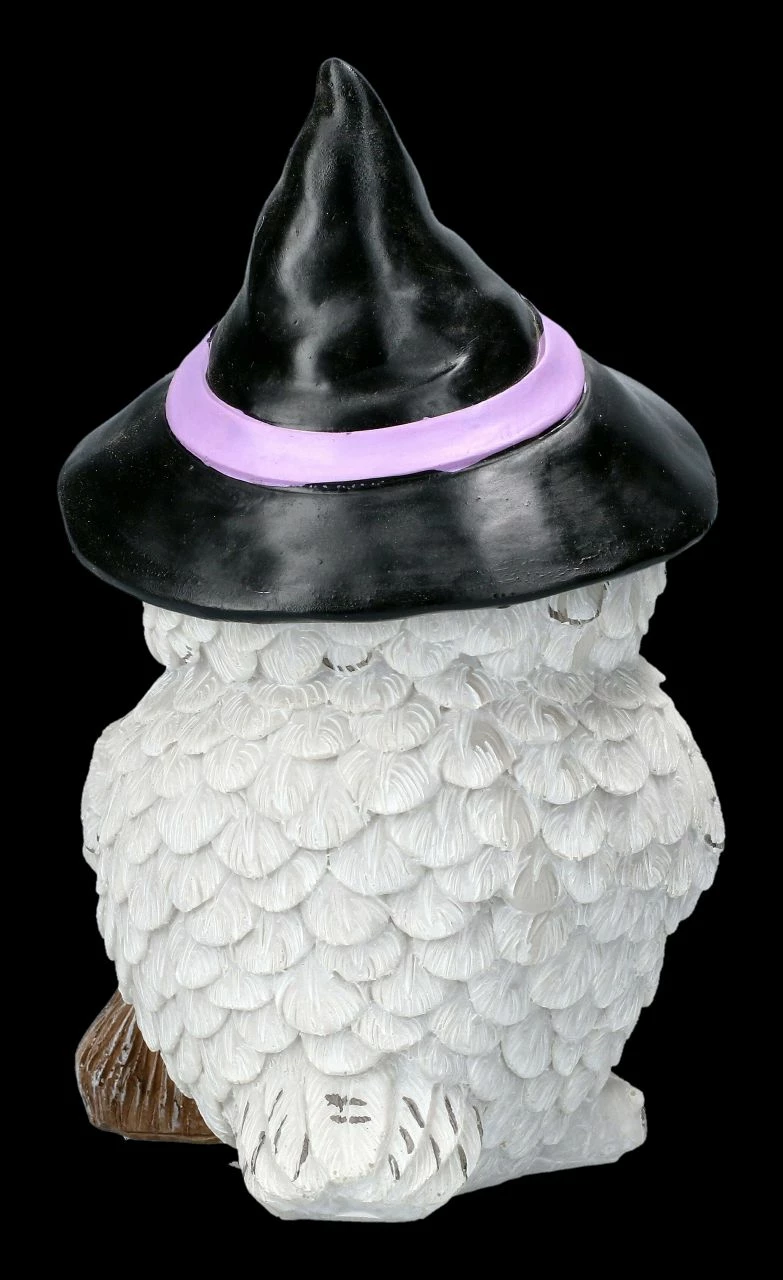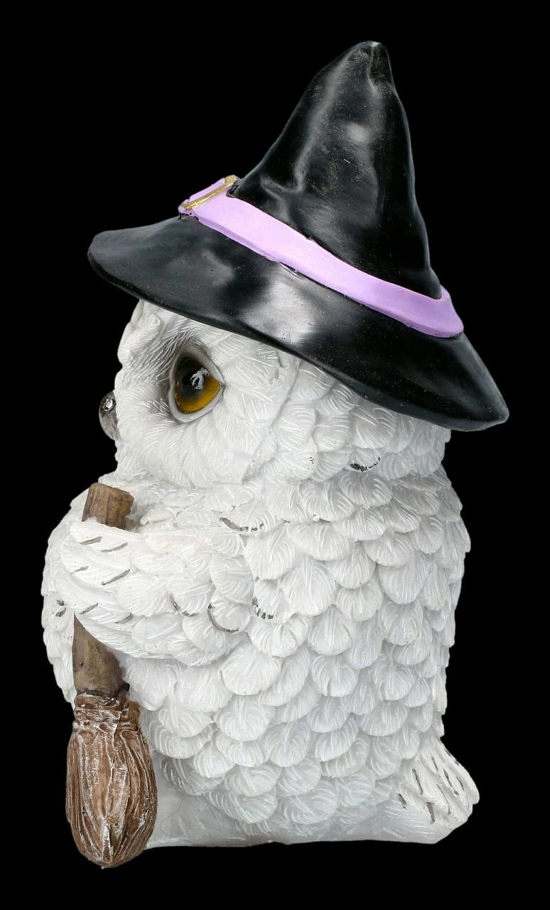 Eulen gelten als weise, hat sich die Hexe gedacht und sich in eine weiße Eule verwandelt. Nur der Hexenhut und der Besen verrät ihre Absicht. Die aus sehr detailliert handbemaltem Kunststein (Polyresin) gefertigte Eule ist 17 cm hoch, 10 cm breit und 9,5 cm tief. Ihre großen sanften Augen zeigen, dass die Hexe keine bösen Absichten verfolgt und dass sie auch ein schönes Geschenk für alle ist, die Eulen lieben.