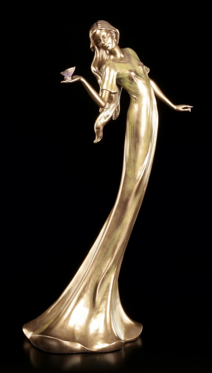 Sieht diese junge Frau nicht höchst elegant aus? So wie sie anmutig zu einem Schmetterling beugt, den sie in der Hand hält. Die Lady mit dem Schmetterling ist ein Kunstwerk vom bekannten Hersteller Veronese. Sie stammt aus der Studio Collection Serie und wurde liebevoll bronziert und coloriert. Durch die überlangen Beine, die schlanke Silhouette und die S-Form des Körpers wirkt die junge Frau lebendig und in Bewegung.