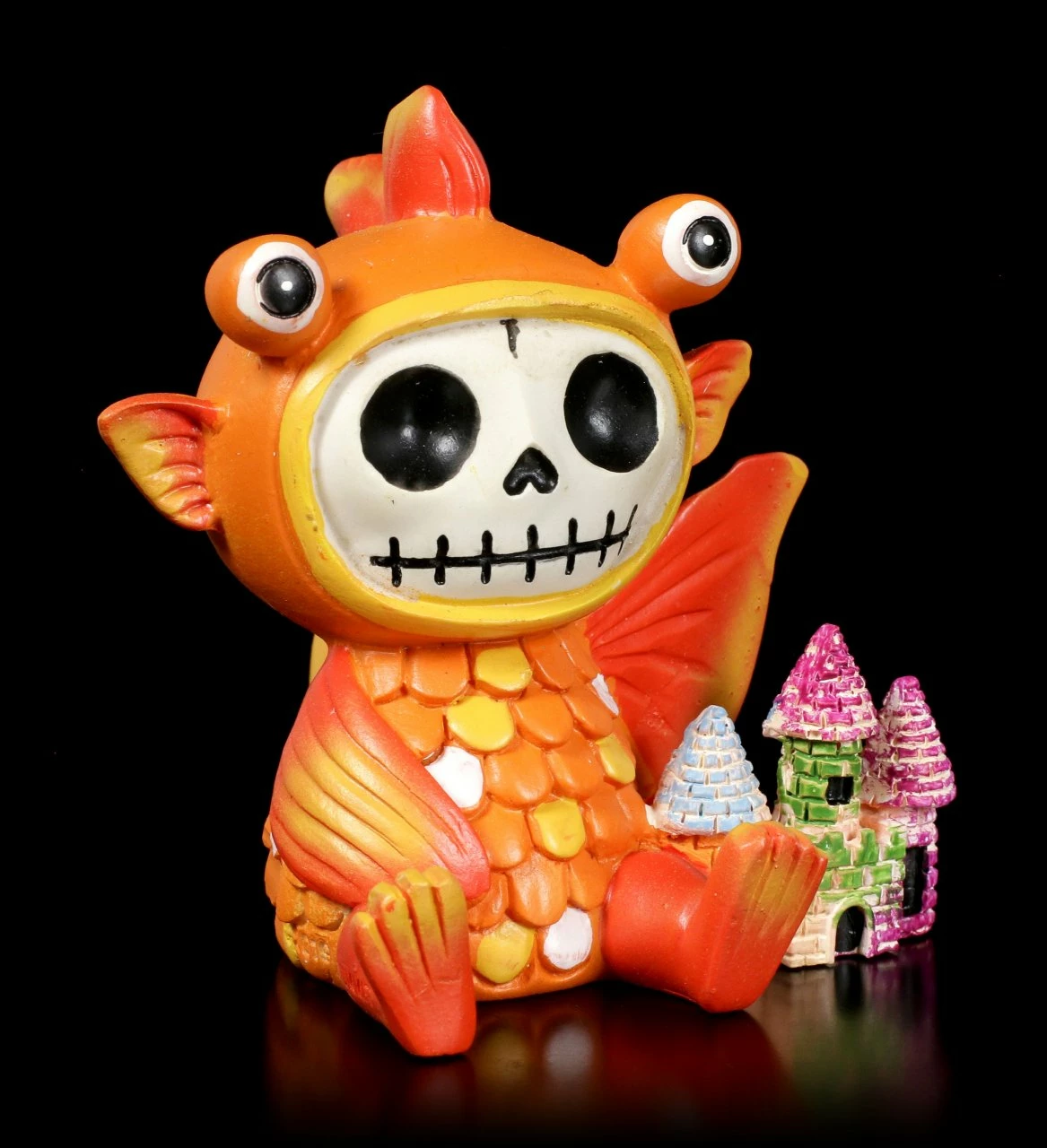 Blubb, Blubb, Blubb… Der kleine Furrybone liebt Fische und heute wollte er ihnen so nah wie möglich sein und hat sich als Goldfisch verkleidet. Sieht er nicht toll aus? Die niedliche Furrybones Figur ist aus Kunststein und wurde liebevoll und farbenprächtig handbemalt.