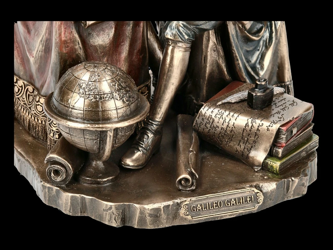 Mit konzentrierter Miene und einem Pergament in der Hand beobachtet Galileo Galilei mit einem Teleskop die Sterne. Um ihn herum stehen viele seiner wichtigsten Forschungsgegenstände. Die Bücher, der Globus und die Sternenkarte auf dem Tisch zeigen, wie sehr Galileo Galilei sich der Wissenschaft verschrieben hat. Diese wunderschöne Figur aus edel bronziertem und coloriertem Kunststein (Polyresin) von Veronese ist eine Hommage an den italienischen Universalgelehrten. Er war Philosoph, Mathematiker, Ingenieur, Physiker, Astronom und Kosmologe und gilt als einer der wichtigsten Neubegründer der exakten Naturwissenschaft.