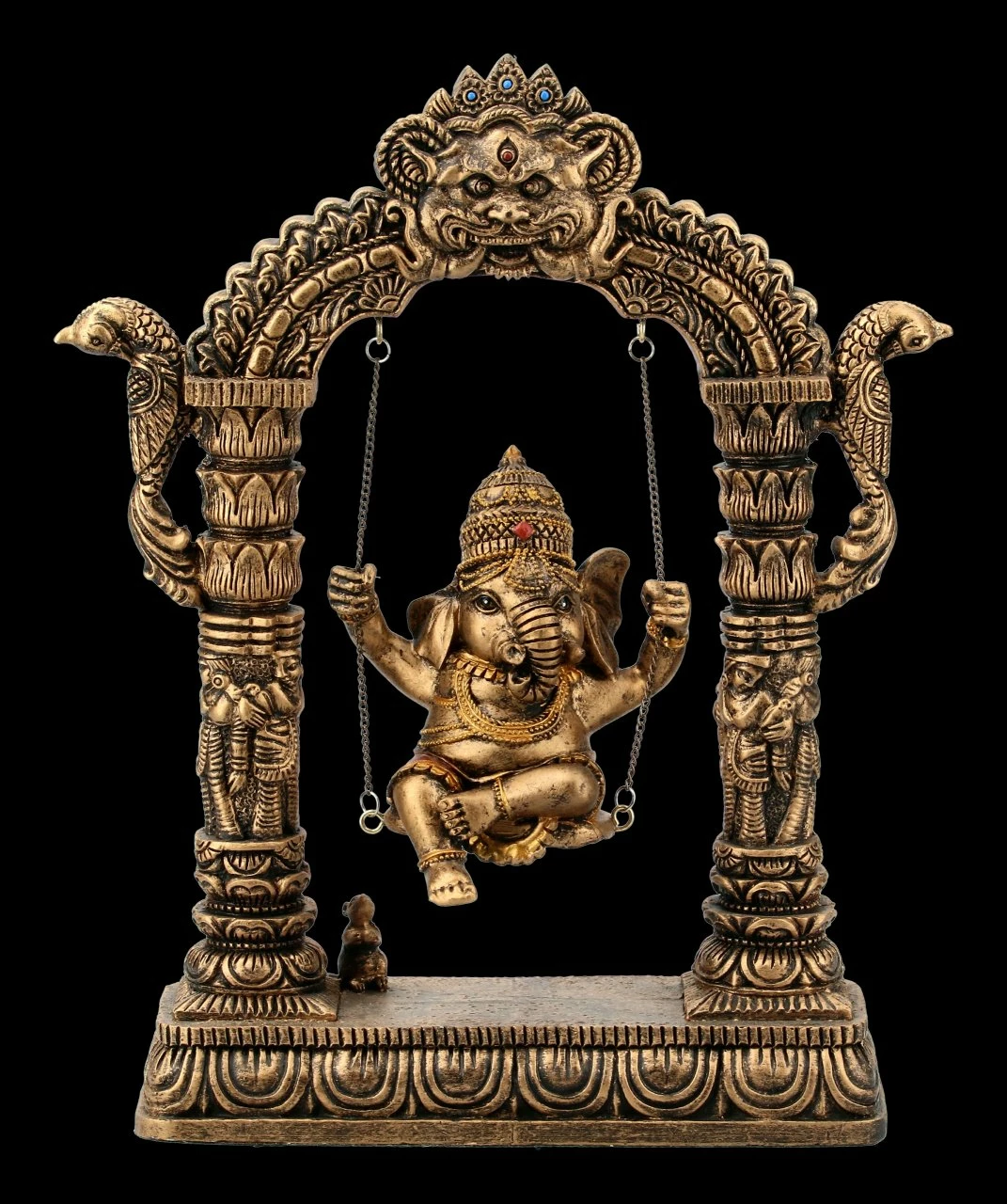 Der Elefantenköpfige Gott Ganesha sitzt fröhlich auf der Schaukel zwischen dem Weltentor. Ganesha steht für die Weisheit, aber auch für die Überwindung von Hindernissen und für einen guten Anfang. Die tolle Ganesha Figur ist mit vielen Details aufwändig aus Kunststein (Polyresin) gefertigt und sorgfältig handbemalt. Sie ist 24 cm hoch, 20 cm breit und 6 cm tief. Als Glücksbringer ist diese tolle Ganesha Figur ein ganz besonderes Geschenk. Sie ist aber auch in Ihrem eigenen Wohn- oder Arbeitsbereich der absolute Hingucker.