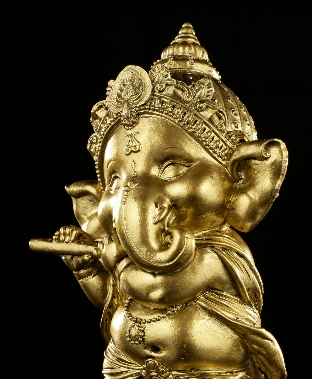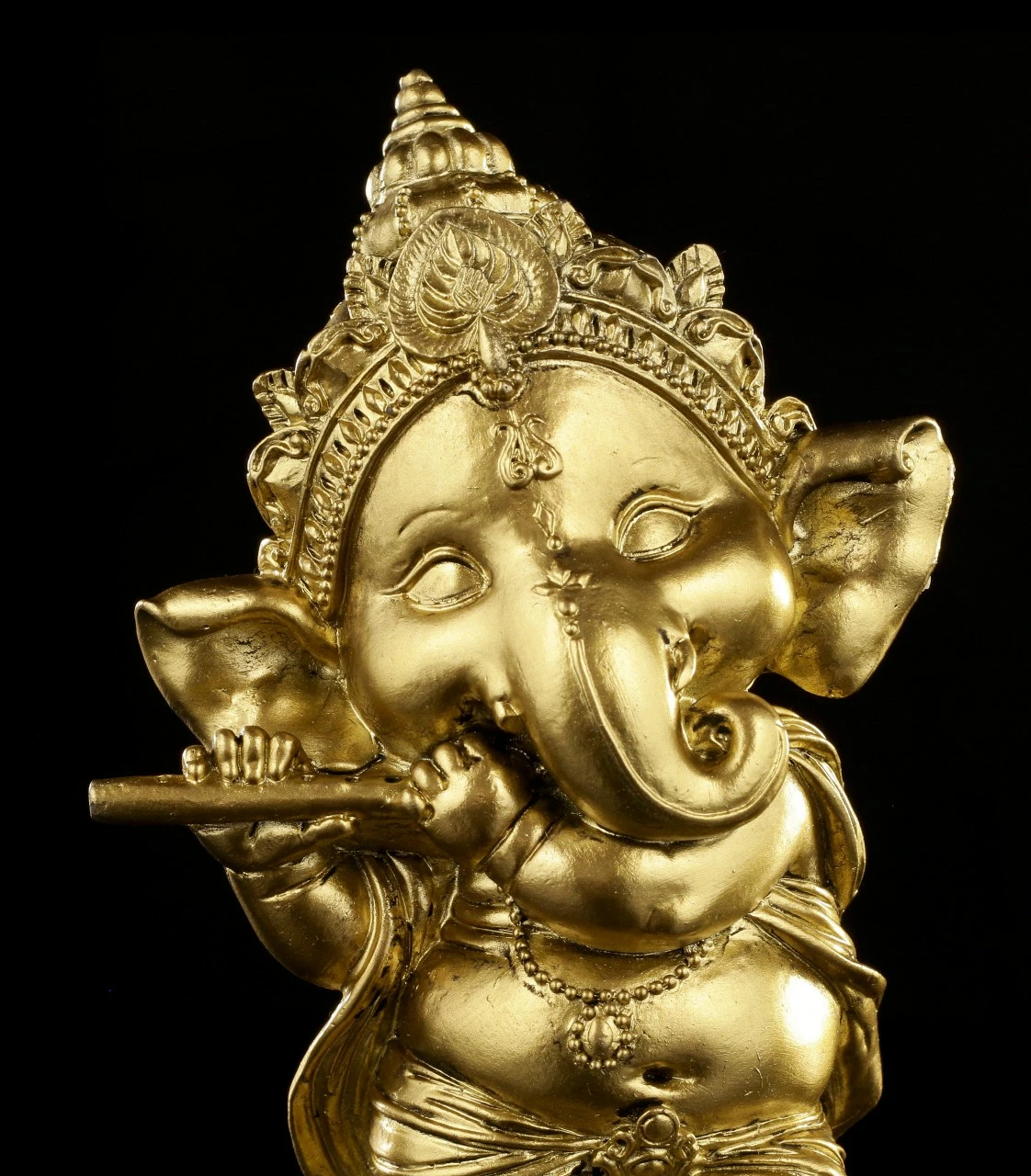 Diese goldfarbene Ganesha Figur sollte in keiner Sammlung fehlen. Ganesha ist eine sehr lebensfrohe und musikalische Gottheit im Hinduismus.