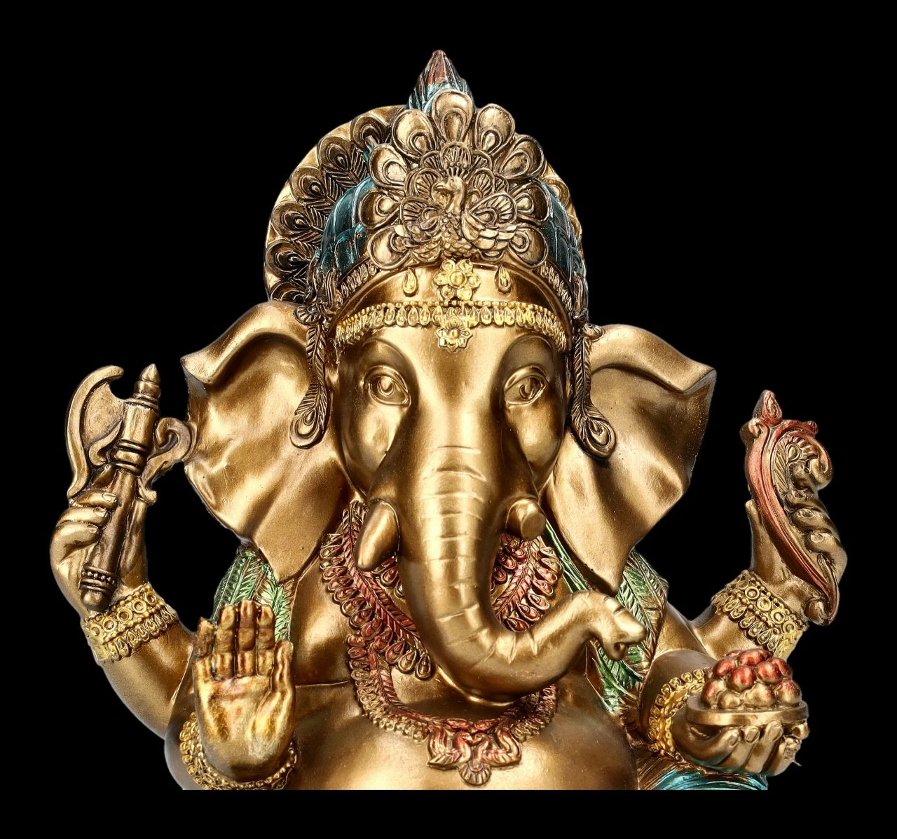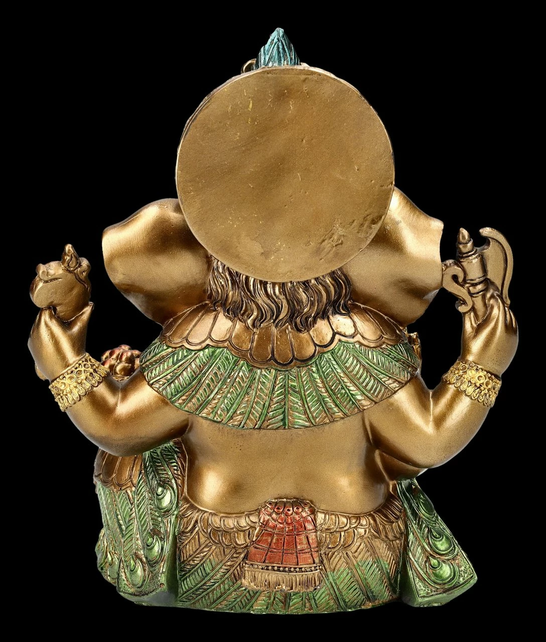 Der nicht nur in Asien sehr beliebte Gott Ganesha mit dem Menschenkörper und dem Elefantenkopf wird stets mit vier Armen dargestellt. Die vier Arme stehen für die vier Aspekte des feinstofflichen Körpers – also für Geist, Intellekt, Bewusstsein und Selbstbewusstsein. Ganesha gilt nicht nur als Symbol für eine leicht zugängliche Energie, für das Genießen der schönen Seiten des Lebens und seine lebenspraktische Weisheit, sondern ist in Asien als Gott der Weisheit, der Wissenschaften und der Künste.auch für Schulkinder von großer Bedeutung. Die wunderbare Gahesha-Figur mit den vier Händen ist 20 cm hoch, 17 cm breit und 12,5 cm tief und wurde aus sorgfältig und detailreich handbemaltem Kunststein (Polyresin) gefertigt. Sie bringt asiatisches Feeling in jeden Bereich und wirkt durch die Farbgebung sehr authentisch. Diese wunderbare Figur des Gottes Ganesha ist auch als Glücksbringer ein perfektes Geschenk.