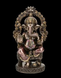 Wie ein Tempelbogen wirkt die Rücklehne des Throns, auf dem der beliebte Gott Ganesha sitzt. Jeder kennt sicher das Bild des Gottes mit dem Menschenkörper und dem Elefantenkopf, der mittlerweile nicht nur in asiatischen Ländern sehr beliebt ist. Ganesha steht für die beste Anfangsenergie und einen guten Beginn, für die Überwindung von Hindernissen, eine praktische und leicht zugängliche Weisheit und schließlich auch für das Genießen der süßen Seiten des Lebens. Seine vier Arme sollen Geist, Intellekt, Ego und Bewusstsein.repräsentieren. Zum Beispiel hält er ein Seil in der Hand, mit dem er den Gläubigen, den er aus seinen weltlichen Problemen hilft und mit ewiger Glückseligkeit verbindet. Diese wunderbare Skulptur des Gottes der Weisheit, der Wissenschaften und der Künste stammt aus der Studio Collection von Veronese. Die 26 cm hohe, 15 cm breite und 9,5 cm tiefe Ganesha Figur unter dem Tempelbogen wurde sorgfältig und detailreich aus edel bronziertem und schön coloriertem Kunststein (Polyresin) gefertigt. Sie bringt ein festliches und asiatisches Feeling in jedes Ambiente und ist als Glücksbringer auch ein wunderbares Geschenk zum Beispiel für jeden, dem man einen guten Start bei einem Vorhaben wünscht.